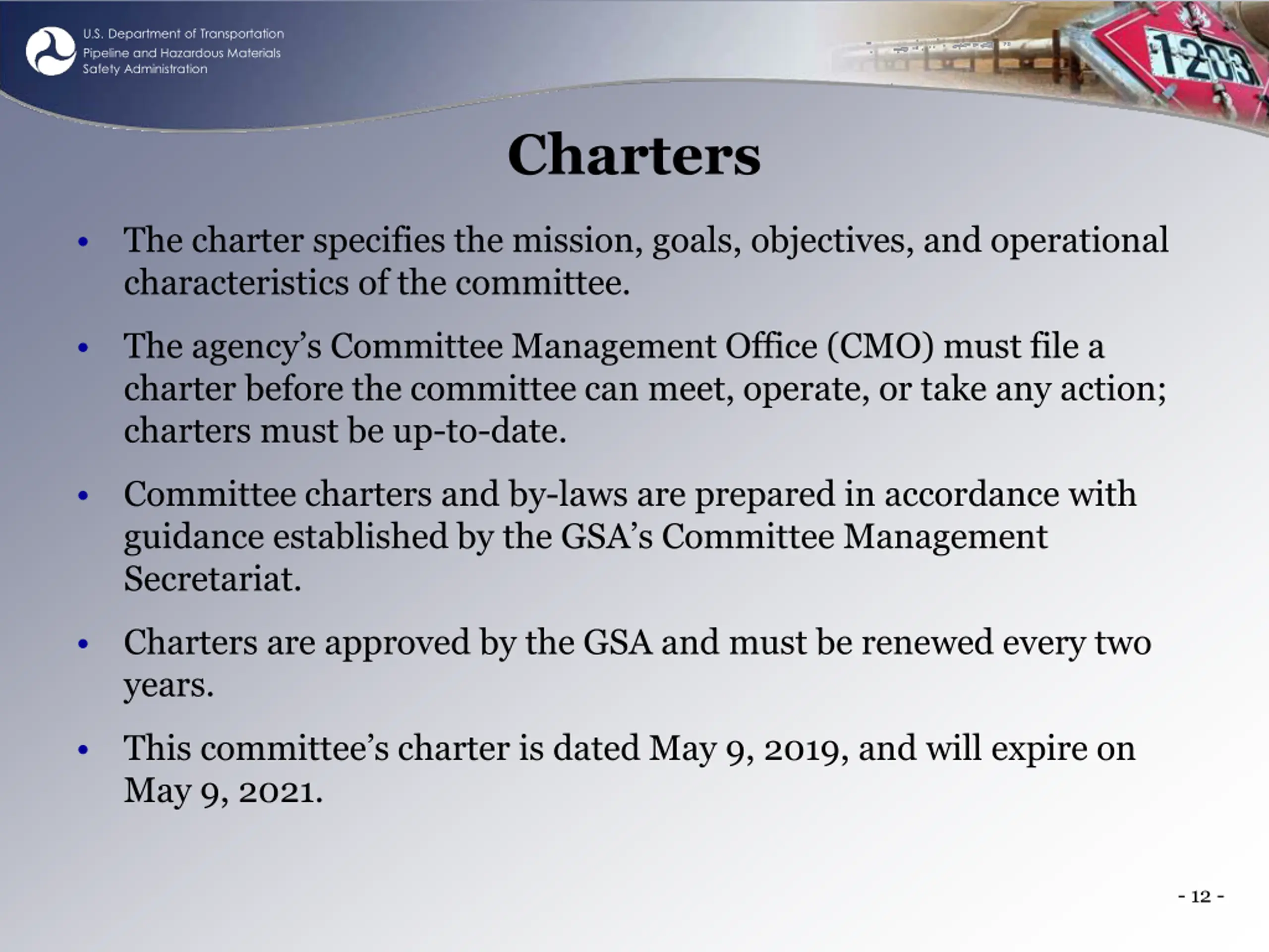 U.S. Department of Transportation Pipeline and Hazardous Materials Safety Administration Charters The charter specifies the mission, goals, objectives, and operational characteristics of the committee. The agency s Committee Management Office (CMO) must file a charter before the committee can meet, operate, or take any action; charters must be up-to-date. Committee charters and by-laws are prepared in accordance with guidance established by the GSA s Committee Management Secretariat. Charters are approved by the GSA and must be renewed every two years. This committee s charter is dated May 9, 2019, and will expire on May 9, 2021. - 12 -