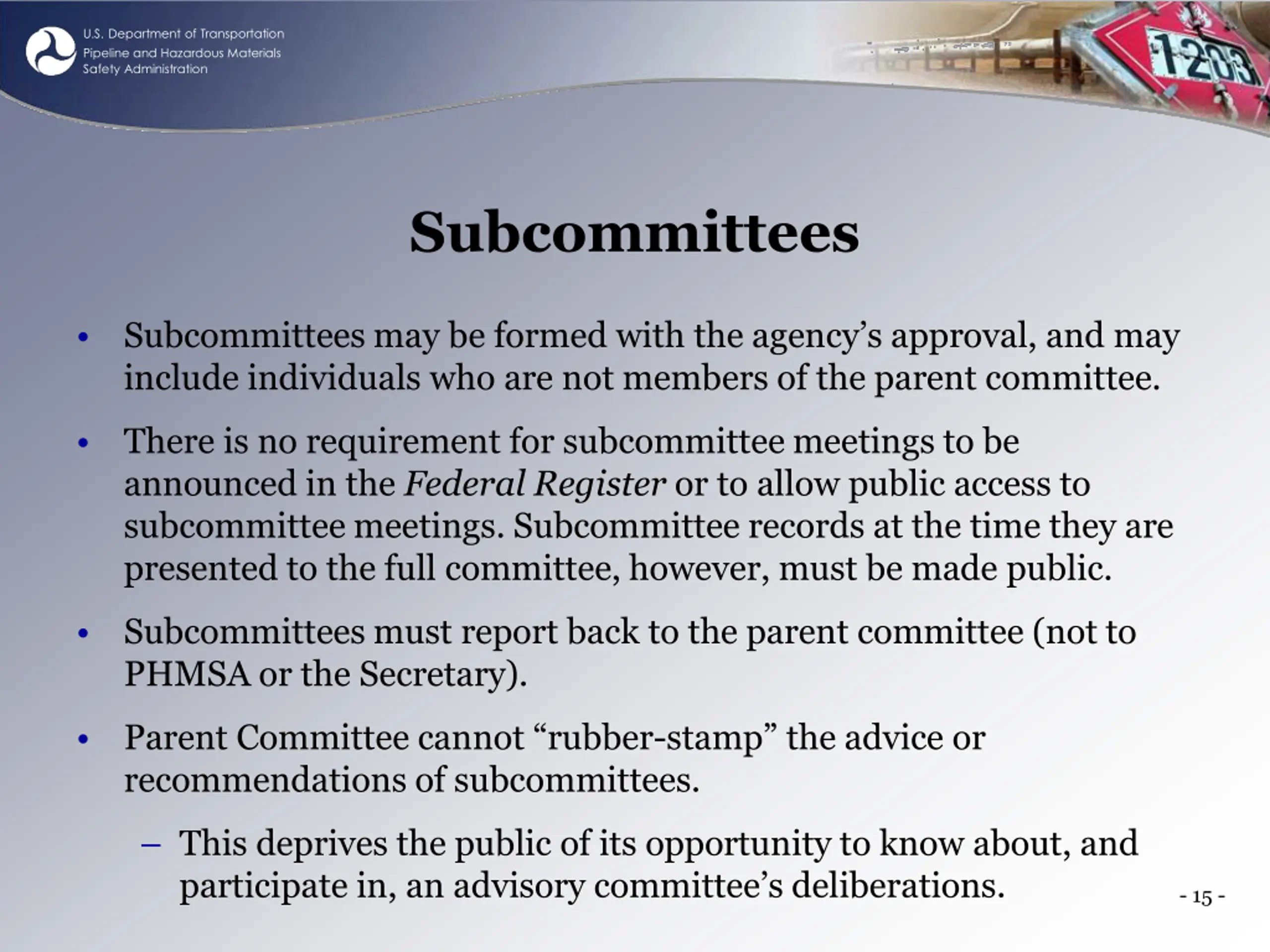 U.S. Department of Transportation Pipeline and Hazardous Materials Safety Administration Subcommittees Subcommittees may be formed with the agency s approval, and may include individuals who are not members of the parent committee. There is no requirement for subcommittee meetings to be announced in the Federal Register or to allow public access to subcommittee meetings. Subcommittee records at the time they are presented to the full committee, however, must be made public. Subcommittees must report back to the parent committee (not to PHMSA or the Secretary). Parent Committee cannot rubber-stamp the advice or recommendations of subcommittees. This deprives the public of its opportunity to know about, and participate in, an advisory committee s deliberations. - 15 -