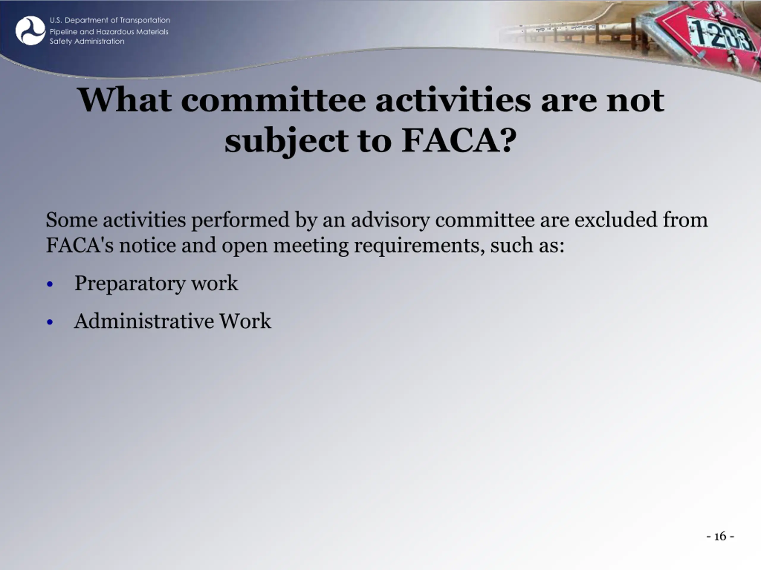 U.S. Department of Transportation Pipeline and Hazardous Materials Safety Administration What committee activities are not subject to FACA? Some activities performed by an advisory committee are excluded from FACA's notice and open meeting requirements, such as: Preparatory work Administrative Work - 16 -