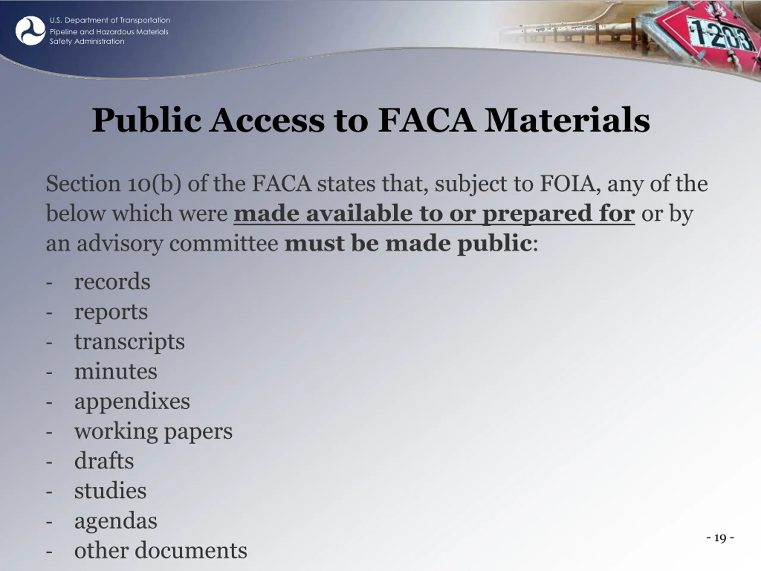 U.S. Department of Transportation Pipeline and Hazardous Materials Safety Administration Public Access to FACA Materials Section 10(b) of the FACA states that, subject to FOIA, any of the below which were made available to or prepared for or by an advisory committee must be made public: records reports transcripts minutes appendixes working papers drafts studies agendas other documents - - - - - - - - - - - 19 -