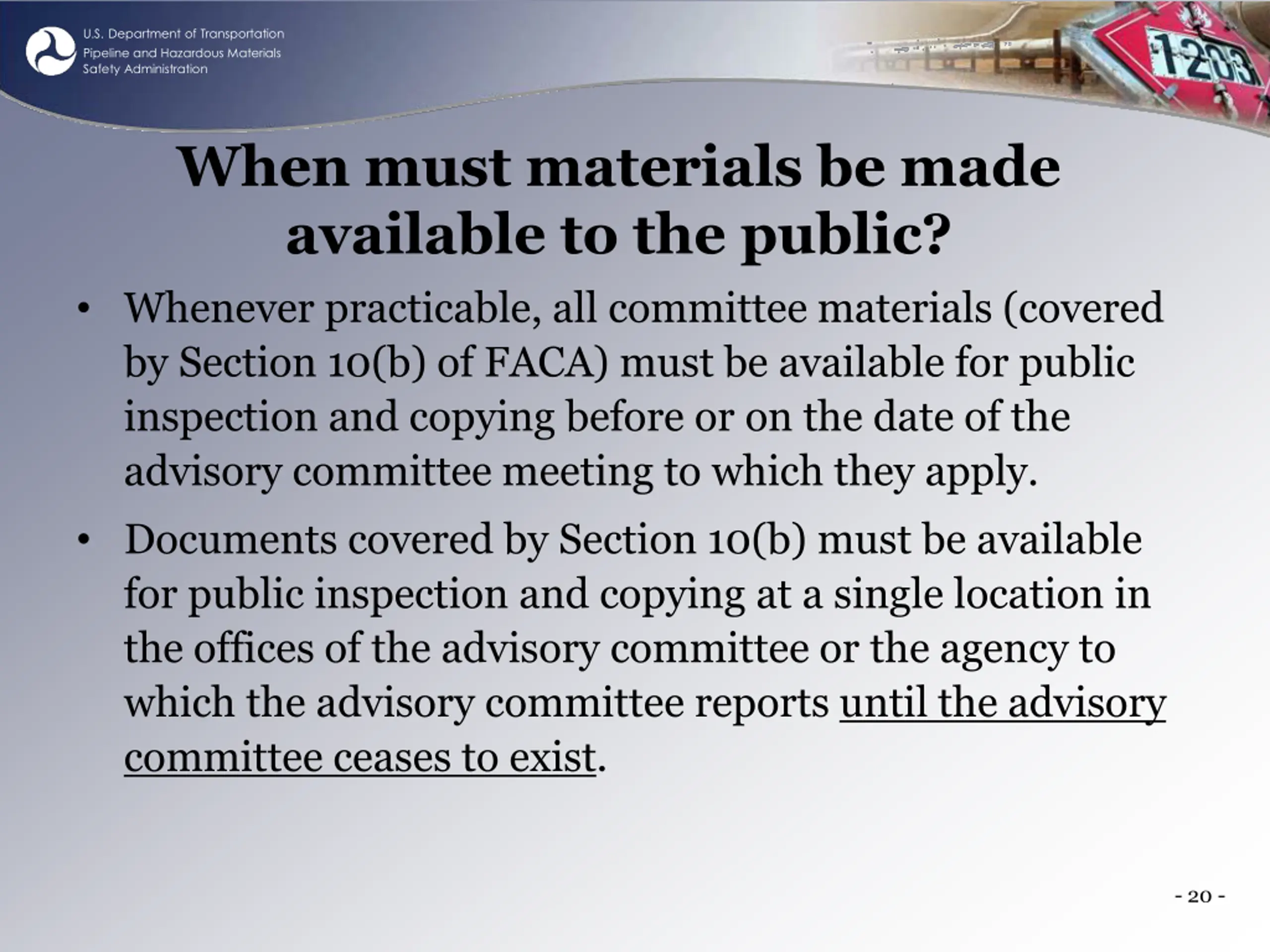 U.S. Department of Transportation Pipeline and Hazardous Materials Safety Administration When must materials be made available to the public? Whenever practicable,all committee materials (covered by Section 10(b) of FACA) must be available for public inspection and copying before or on the date of the advisory committee meeting to which they apply. Documents covered by Section 10(b) must be available for public inspection and copying at a single location in the offices of the advisory committee or the agency to which the advisory committee reports until the advisory committee ceases to exist. - 20 -