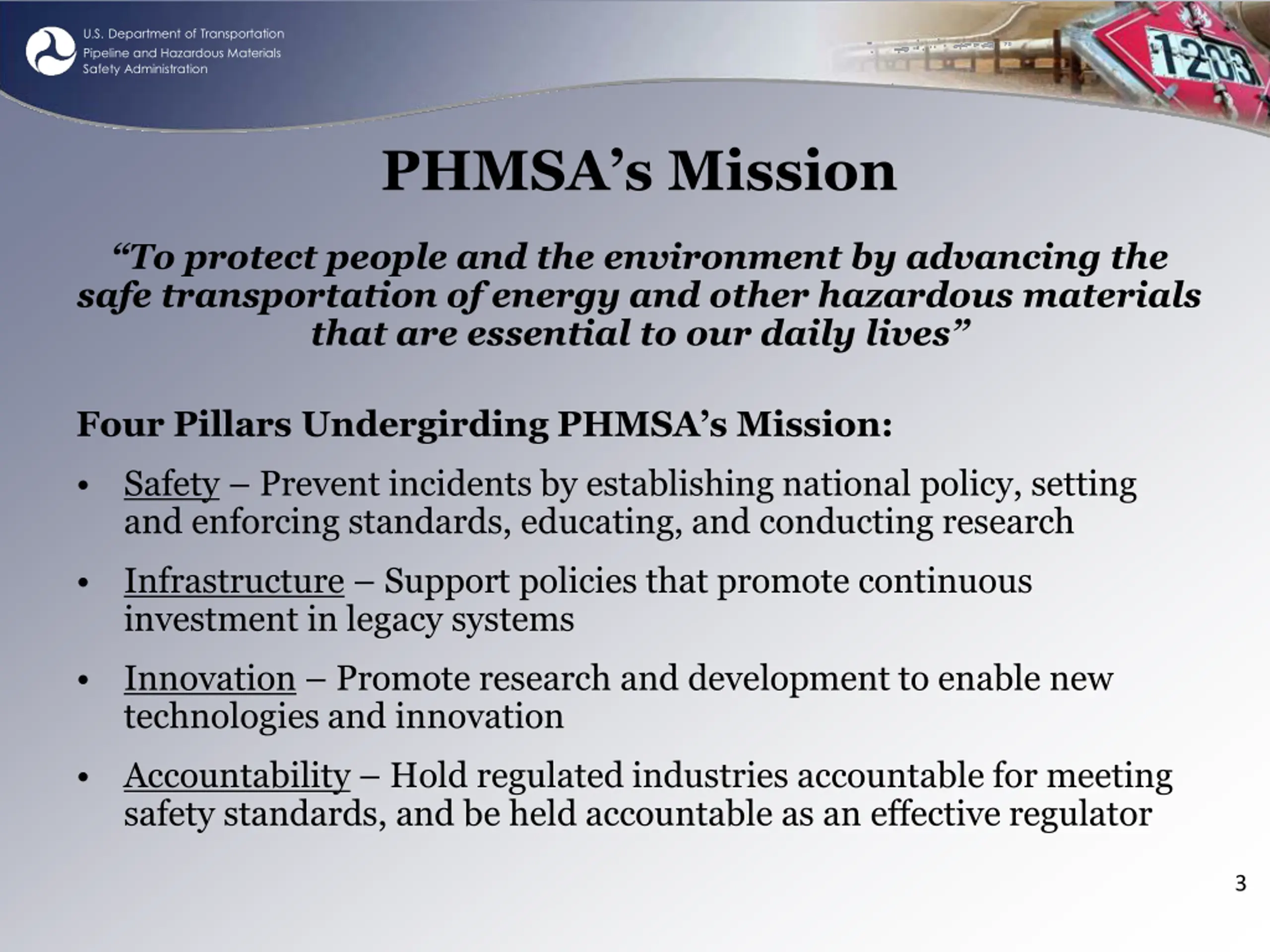 U.S. Department of Transportation Pipeline and Hazardous Materials Safety Administration PHMSA s Mission To protect people and the environment by advancing the safe transportation of energy and other hazardous materials that are essential to our daily lives Four Pillars Undergirding PHMSA s Mission: Safety Prevent incidents by establishing national policy, setting and enforcing standards, educating, and conducting research Infrastructure Support policies that promote continuous investment in legacy systems Innovation Promote research and development to enable new technologies and innovation Accountability Hold regulated industries accountable for meeting safety standards, and be held accountable as an effective regulator 3