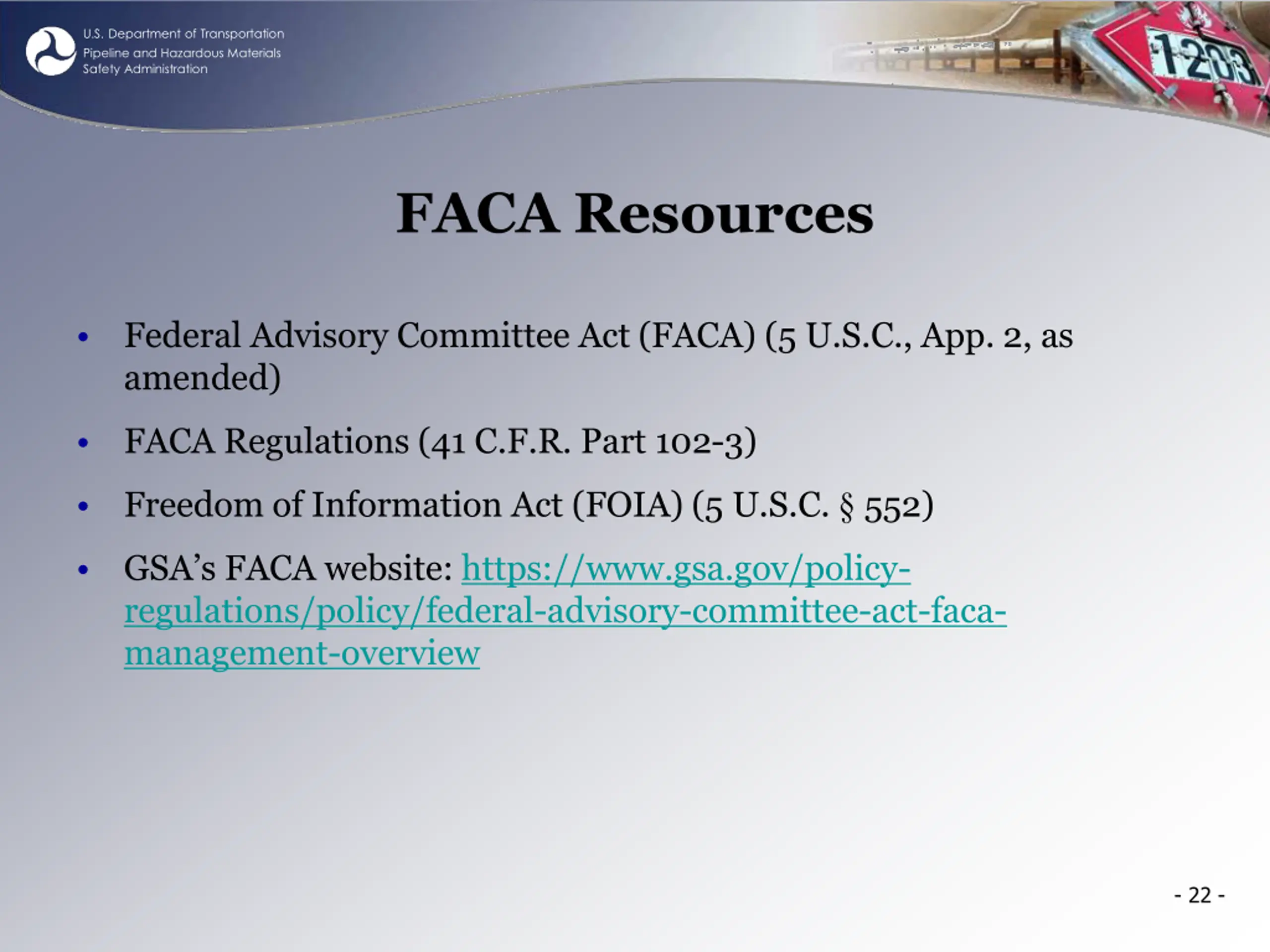U.S. Department of Transportation Pipeline and Hazardous Materials Safety Administration FACA Resources Federal Advisory Committee Act (FACA) (5 U.S.C., App. 2, as amended) FACA Regulations (41 C.F.R. Part 102-3) Freedom of Information Act (FOIA) (5 U.S.C. 552) GSA s FACA website: https://www.gsa.gov/policy- regulations/policy/federal-advisory-committee-act-faca- management-overview - 22 -