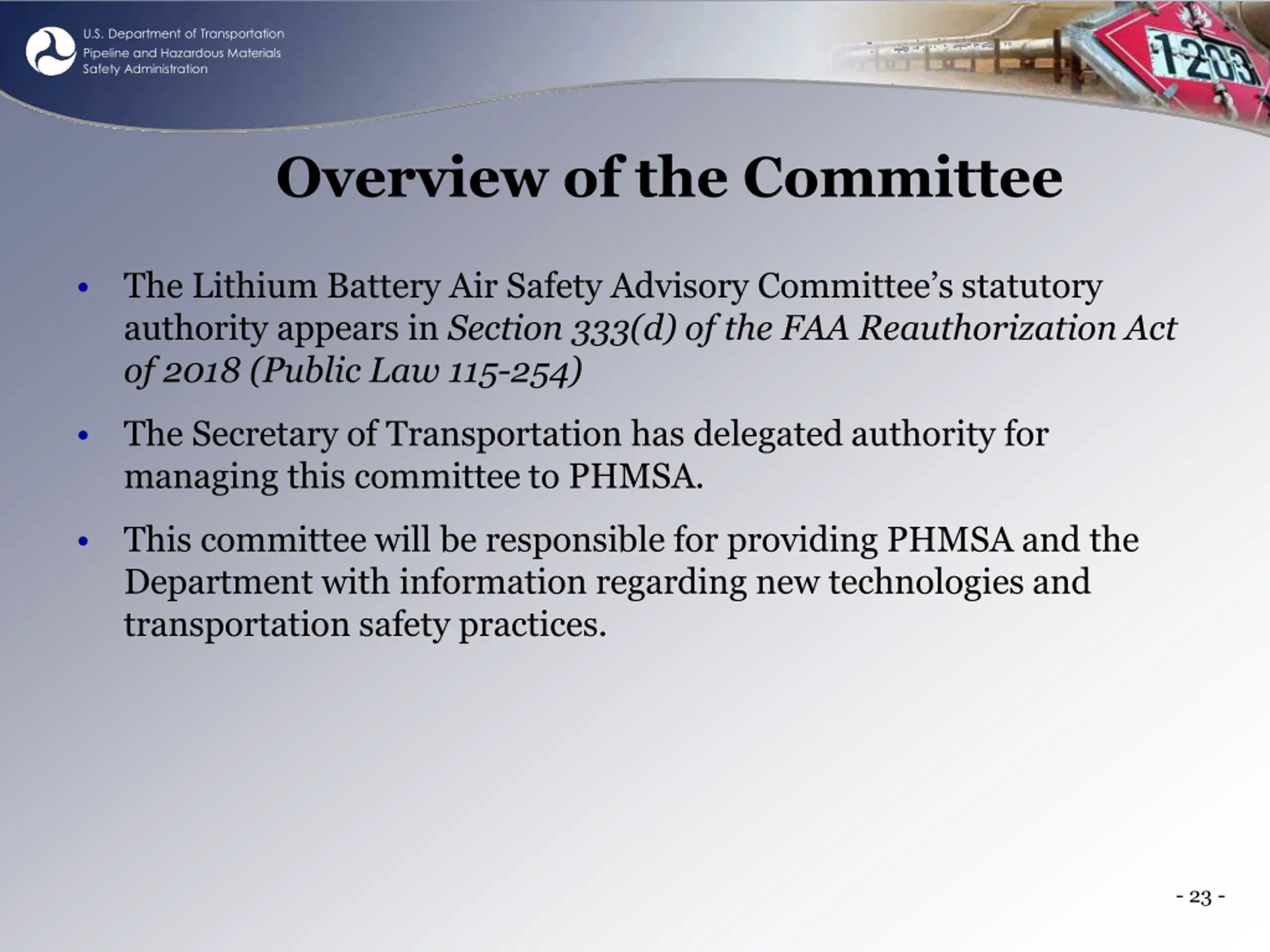 U.S. Department of Transportation Pipeline and Hazardous Materials Safety Administration Overview of the Committee The Lithium Battery Air Safety Advisory Committee s statutory authority appears in Section 333(d) of the FAA Reauthorization Act of 2018 (Public Law 115-254) The Secretary of Transportation has delegated authority for managing this committee to PHMSA. This committee will be responsible for providing PHMSA and the Department with information regarding new technologies and transportation safety practices. - 23 -