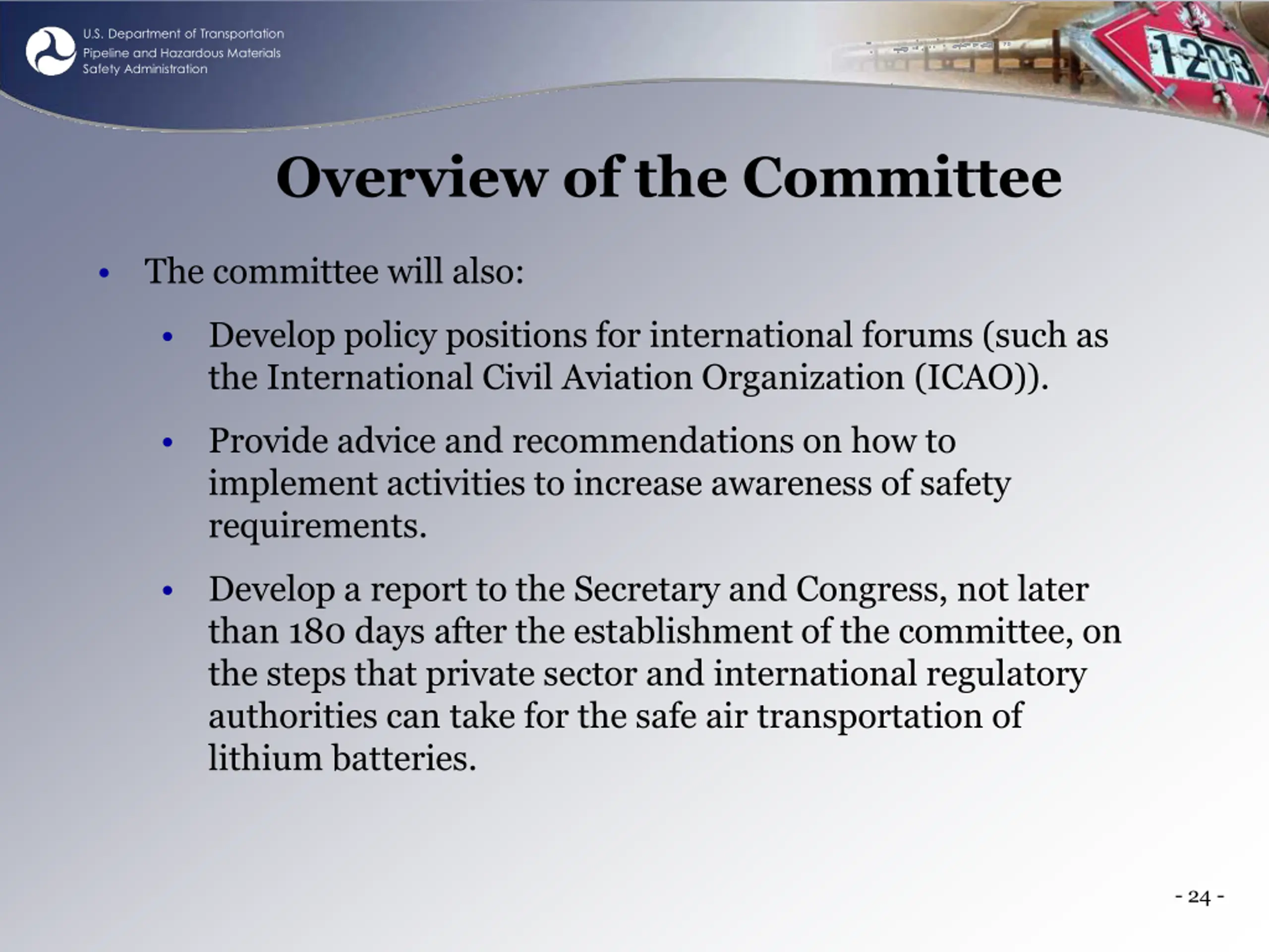 U.S. Department of Transportation Pipeline and Hazardous Materials Safety Administration Overview of the Committee The committee will also: Develop policy positions for international forums (such as the International Civil Aviation Organization (ICAO)). Provide advice and recommendations on how to implement activities to increase awareness of safety requirements. Develop a report to the Secretary and Congress, not later than 180 days after the establishment of the committee, on the steps that private sector and international regulatory authorities can take for the safe air transportation of lithium batteries. - 24 -