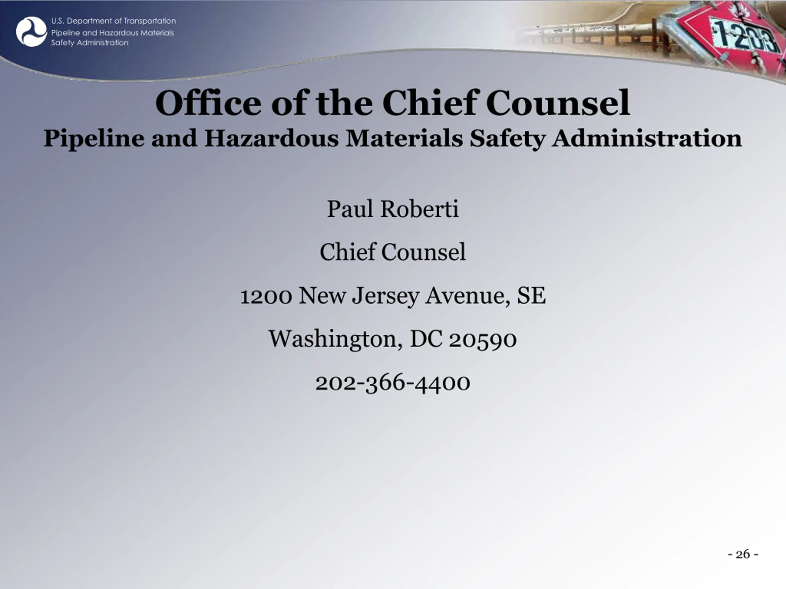 U.S. Department of Transportation Pipeline and Hazardous Materials Safety Administration Office of the Chief Counsel Pipeline and Hazardous Materials Safety Administration Paul Roberti Chief Counsel 1200 New Jersey Avenue, SE Washington, DC 20590 202-366-4400 - 26 -