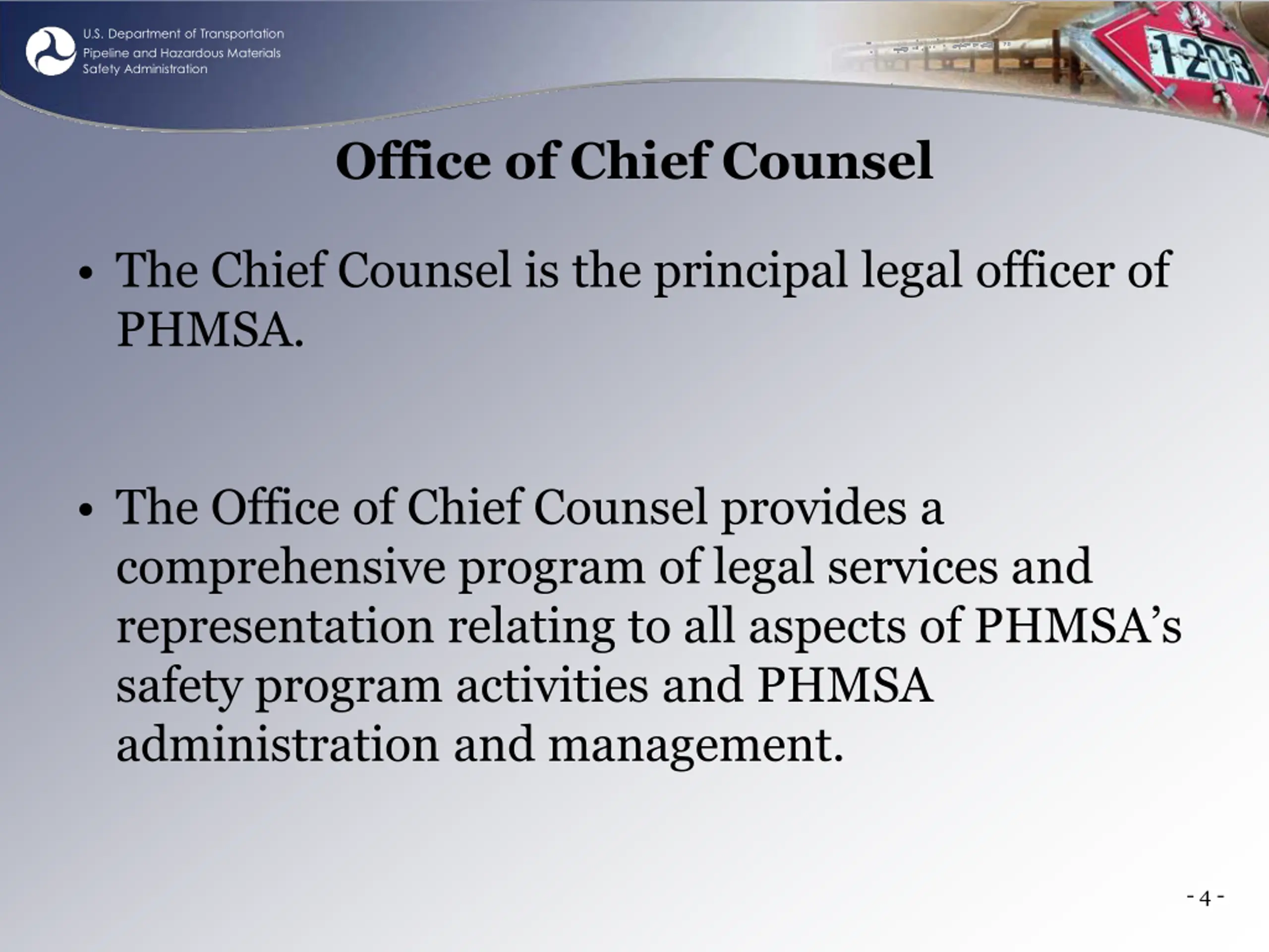 U.S. Department of Transportation Pipeline and Hazardous Materials Safety Administration Office of Chief Counsel The Chief Counsel is the principal legal officer of PHMSA. The Office of Chief Counsel provides a comprehensive program of legal services and representation relating to all aspects of PHMSA s safety program activities and PHMSA administration and management. - 4 -