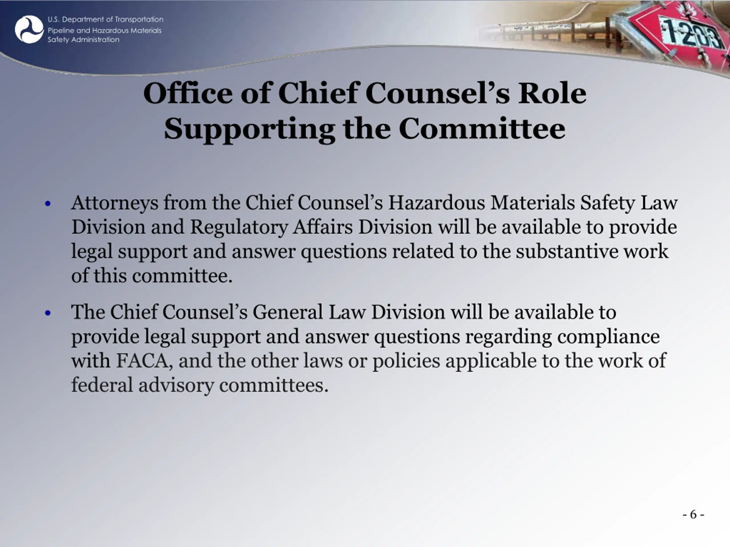 U.S. Department of Transportation Pipeline and Hazardous Materials Safety Administration Office of Chief Counsel s Role Supporting the Committee Attorneys from the Chief Counsel s Hazardous Materials Safety Law Division and Regulatory Affairs Division will be available to provide legal support and answer questions related to the substantive work of this committee. The Chief Counsel s General Law Division will be available to provide legal support and answer questions regarding compliance with FACA, and the other laws or policies applicable to the work of federal advisory committees. - 6 -