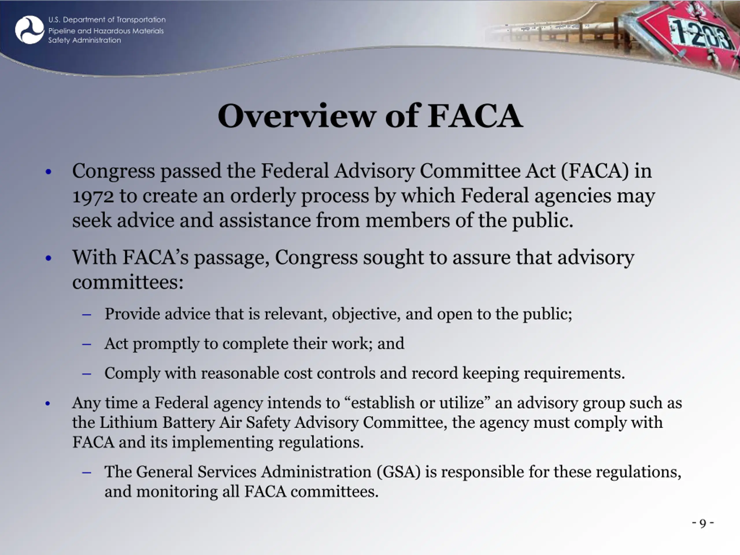 U.S. Department of Transportation Pipeline and Hazardous Materials Safety Administration Overview of FACA Congress passed the Federal Advisory Committee Act (FACA) in 1972 to create an orderly process by which Federal agencies may seek advice and assistance from members of the public. With FACA s passage, Congress sought to assure that advisory committees: Provide advice that is relevant, objective, and open to the public; Act promptly to complete their work; and Comply with reasonable cost controls and record keeping requirements. Any time a Federal agency intends to establish or utilize an advisory group such as the Lithium Battery Air Safety Advisory Committee, the agency must comply with FACA and its implementing regulations. The General Services Administration (GSA) is responsible for these regulations, and monitoring all FACA committees. - 9 -