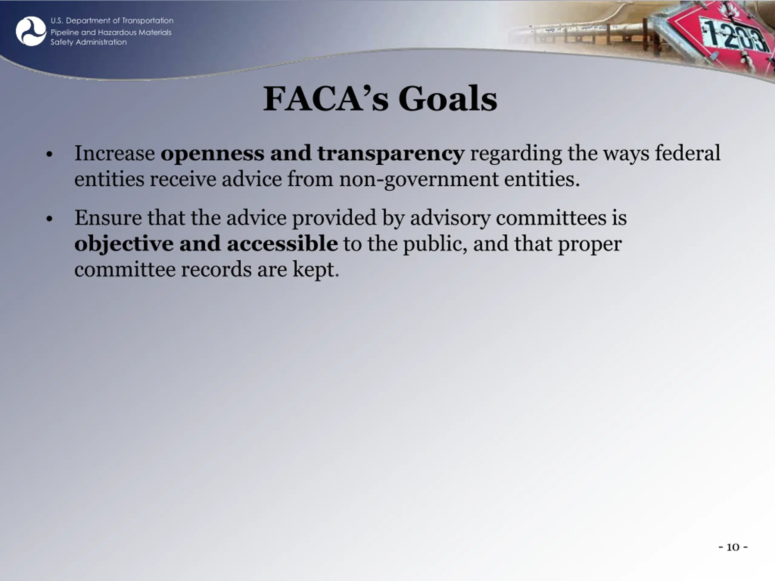 U.S. Department of Transportation Pipeline and Hazardous Materials Safety Administration FACA s Goals Increase openness and transparency regarding the ways federal entities receive advice from non-government entities. Ensure that the advice provided by advisory committees is objective and accessible to the public, and that proper committee records are kept. - 10 -