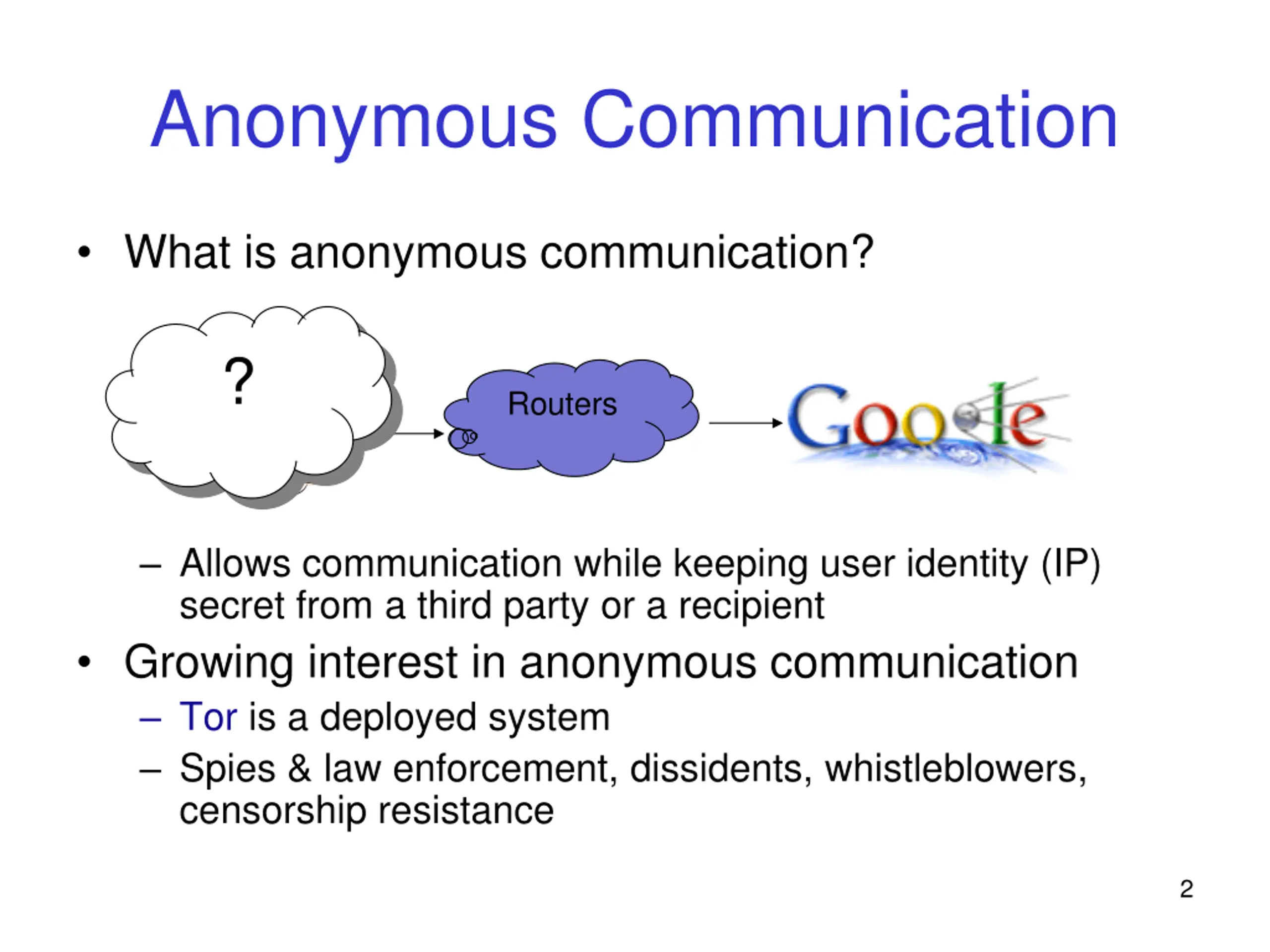 Anonymous Communication What is anonymous communication? ? Routers Allows communication while keeping user identity (IP) secret from a third party or a recipient Growing interest in anonymous communication Tor is a deployed system Spies & law enforcement, dissidents, whistleblowers, censorship resistance 2