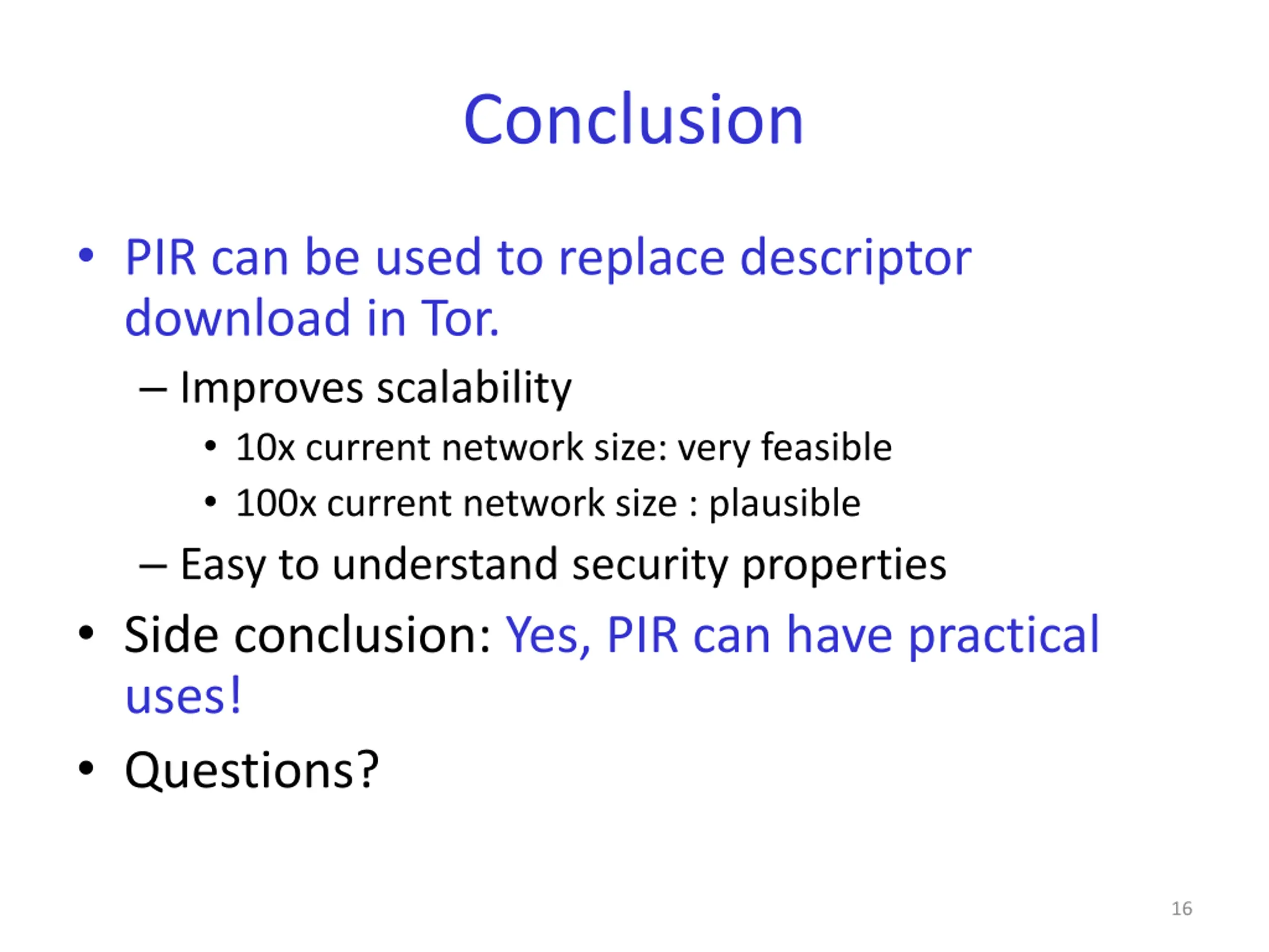 Conclusion PIR can be used to replace descriptor download in Tor. Improves scalability 10x current network size: very feasible 100x current network size : plausible Easy to understand security properties Side conclusion: Yes, PIR can have practical uses! Questions? 16