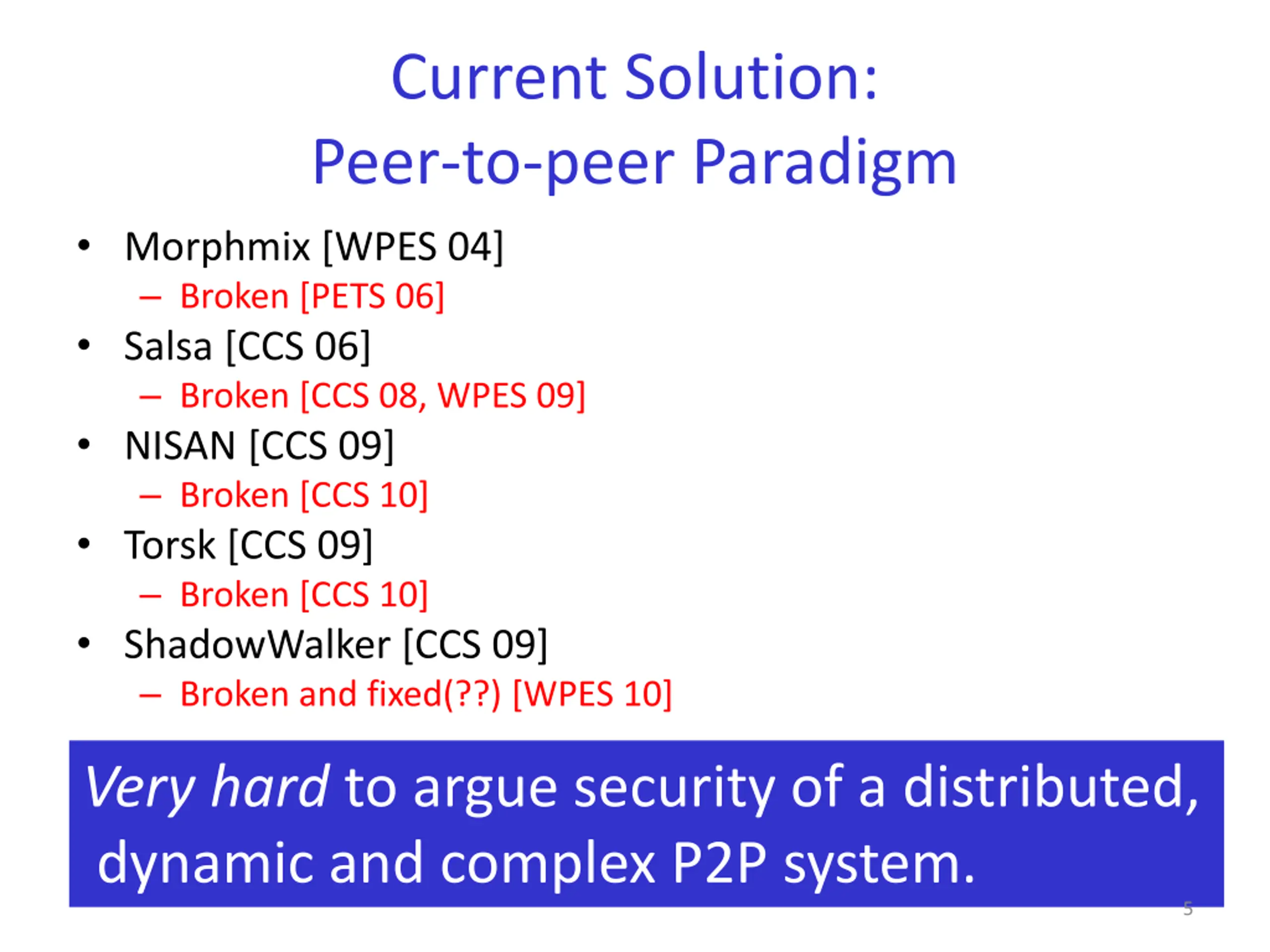 Current Solution: Peer-to-peer Paradigm Morphmix [WPES 04] Broken [PETS 06] Salsa [CCS 06] Broken [CCS 08, WPES 09] NISAN [CCS 09] Broken [CCS 10] Torsk [CCS 09] Broken [CCS 10] ShadowWalker [CCS 09] Broken and fixed(??) [WPES 10] Very hard to argue security of a distributed, dynamic and complex P2P system. 5