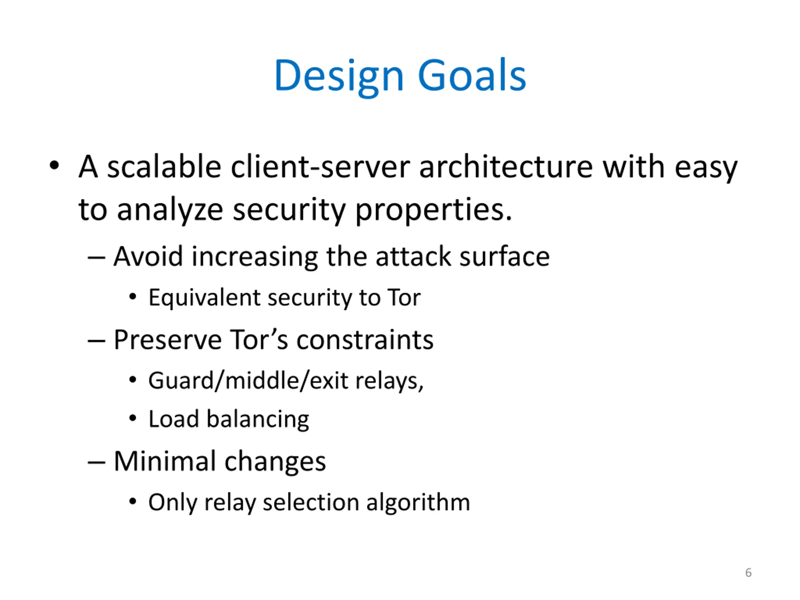 Design Goals A scalable client-server architecture with easy to analyze security properties. Avoid increasing the attack surface Equivalent security to Tor Preserve Tor s constraints Guard/middle/exit relays, Load balancing Minimal changes Only relay selection algorithm 6