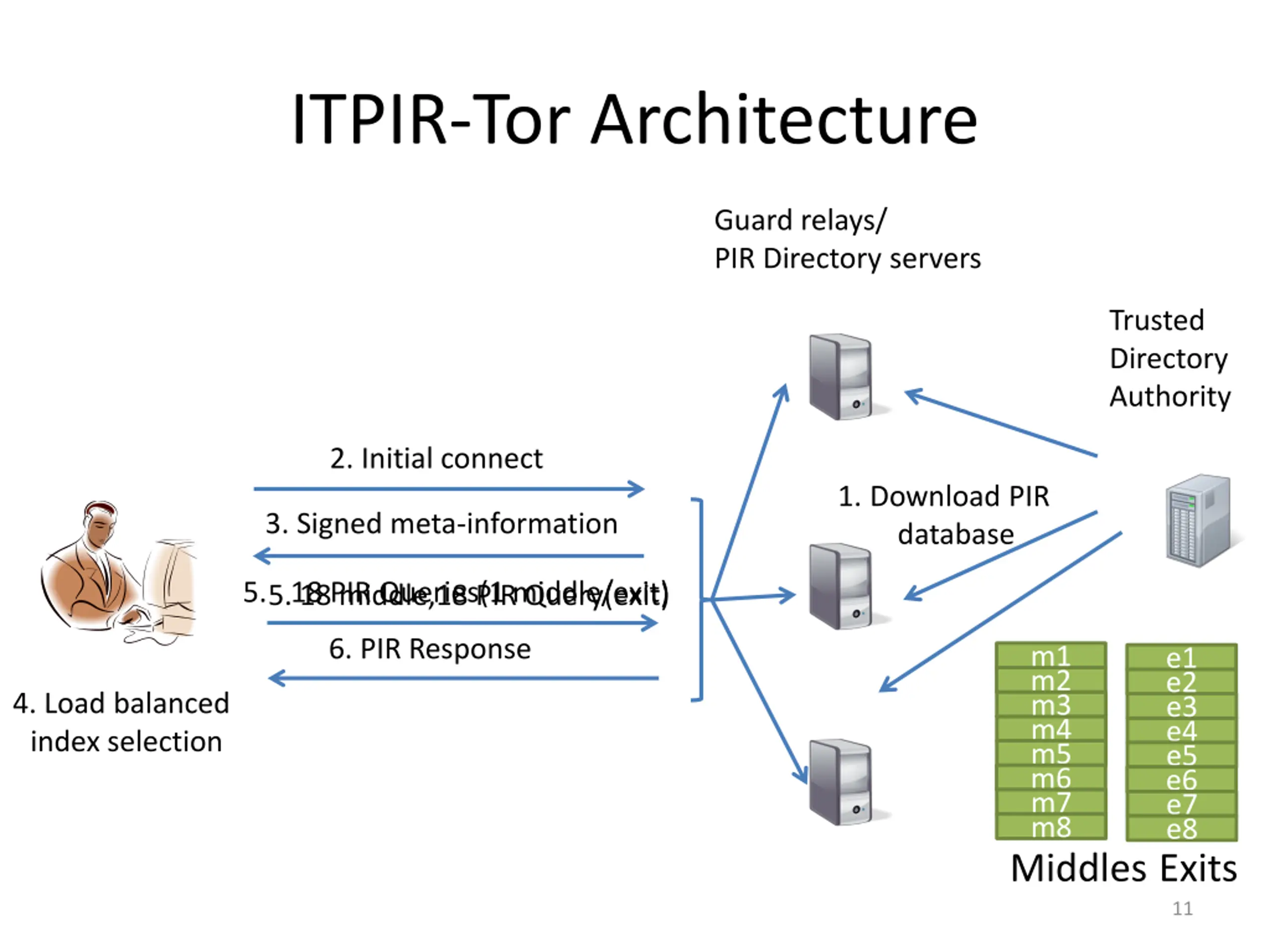 ITPIR-Tor Database Organization and Formatting Middles, exits Separate databases Exit policies Standardized exit policies Relays grouped by exit policies Load balancing Relays sorted by bandwidth Sort by Bandwidth Relay Descriptors m1 e1 m2 e2 Exit Policy 1 m3 e3 m4 m5 m6 m7 m8 e4 e5 e6 e7 e8 Exit Policy 2 Non- standard Exit policies Middles Exits 10
