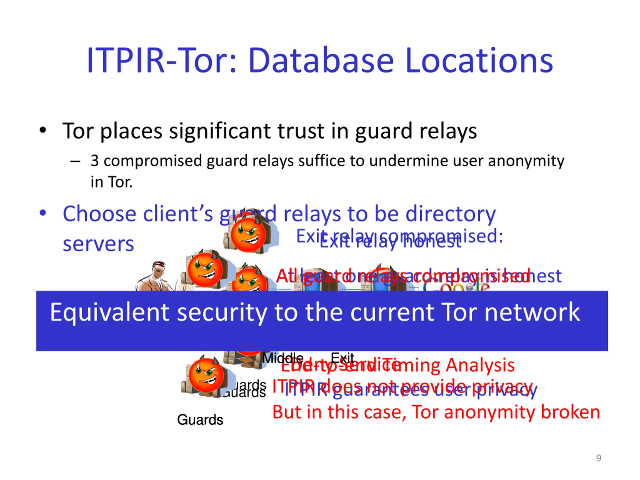 Private Information Retrieval (PIR) Information theoretic PIR Multi-server protocol Threshold number of servers don t collude A B Computational PIR Single server protocol Computational assumption on server Database C A Only ITPIR-Tor in this talk See paper for CPIR-Tor RA Database 8
