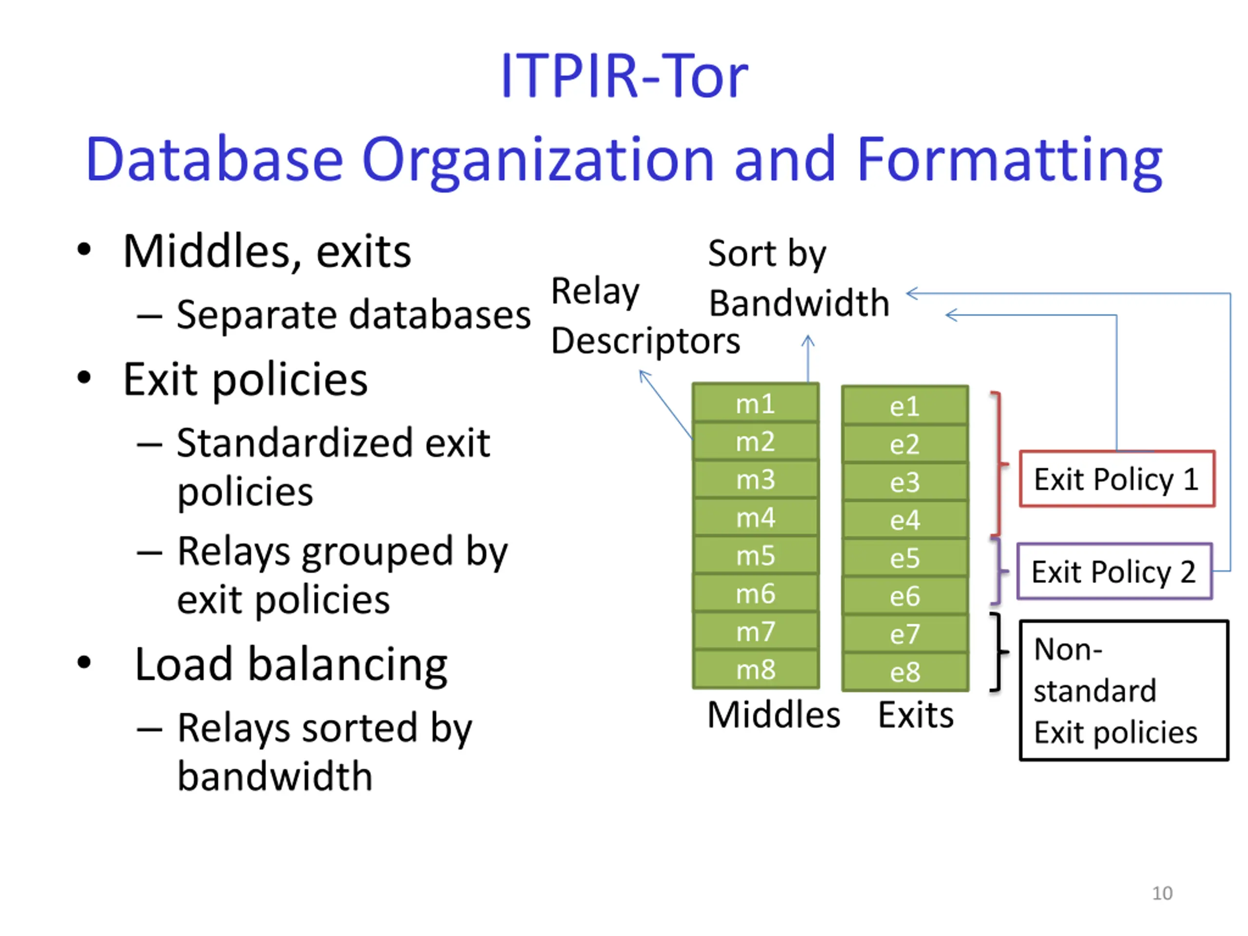 ITPIR-Tor: Database Locations Tor places significant trust in guard relays 3 compromised guard relays suffice to undermine user anonymity in Tor. Choose client s guard relays to be directory servers At least one guard relay is honest All guard relays compromised Equivalent security to the current Tor network Exit relay compromised: Exit relay honest Middle Middle Exit Exit Middle Middle Exit Exit End-to-end Timing Analysis Deny Service ITPIR guarantees user privacy ITPIR does not provide privacy But in this case, Tor anonymity broken Guards Guards Guards Guards 9