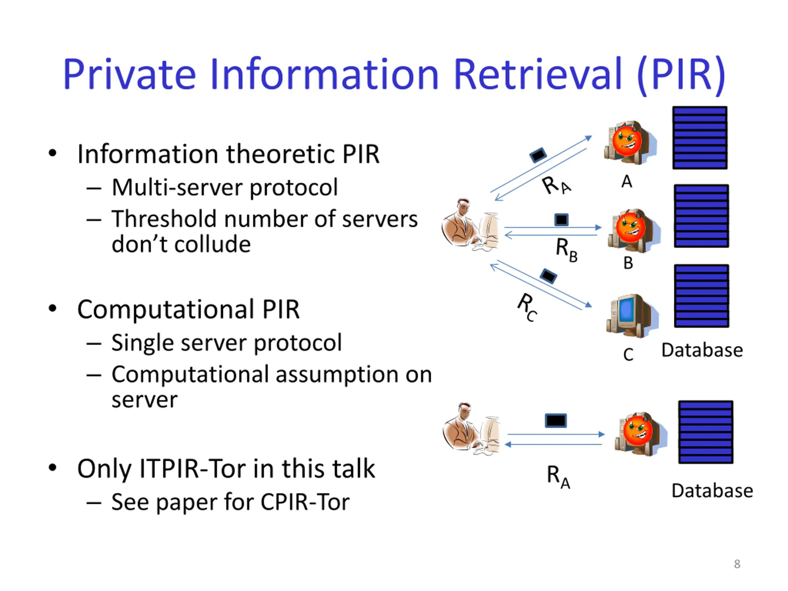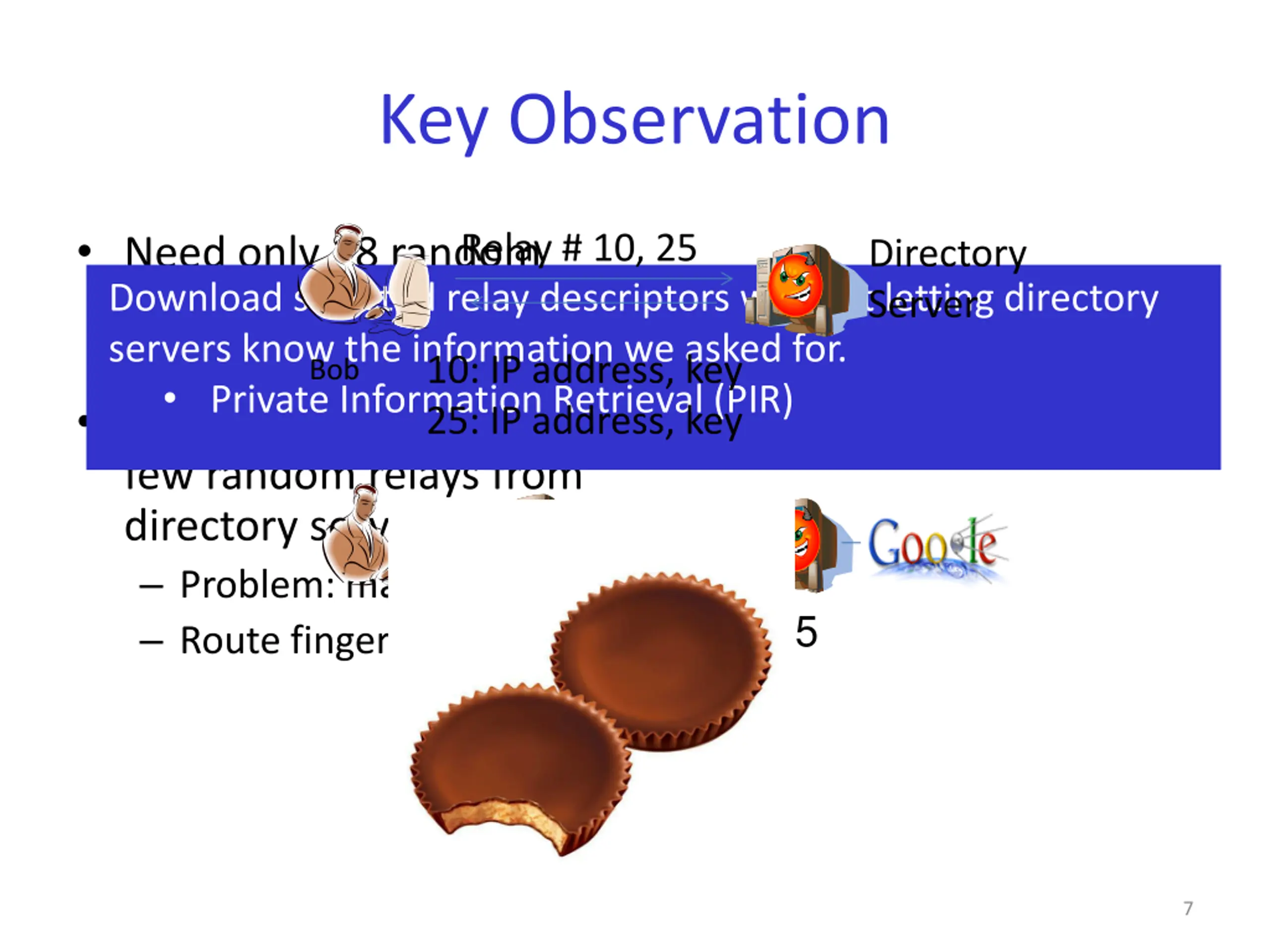 Key Observation Need only 18 random middle/exit relays in 3 hours So don t download all 2000! Na ve approach: download a few random relays from directory servers Problem: malicious servers Route fingerprinting attacks Relay # 10, 25 Directory Server Download selected relay descriptors without letting directory servers know the information we asked for. Private Information Retrieval (PIR) 25: IP address, key 10: IP address, key Bob 10 25 Inference: User likely to be Bob 7