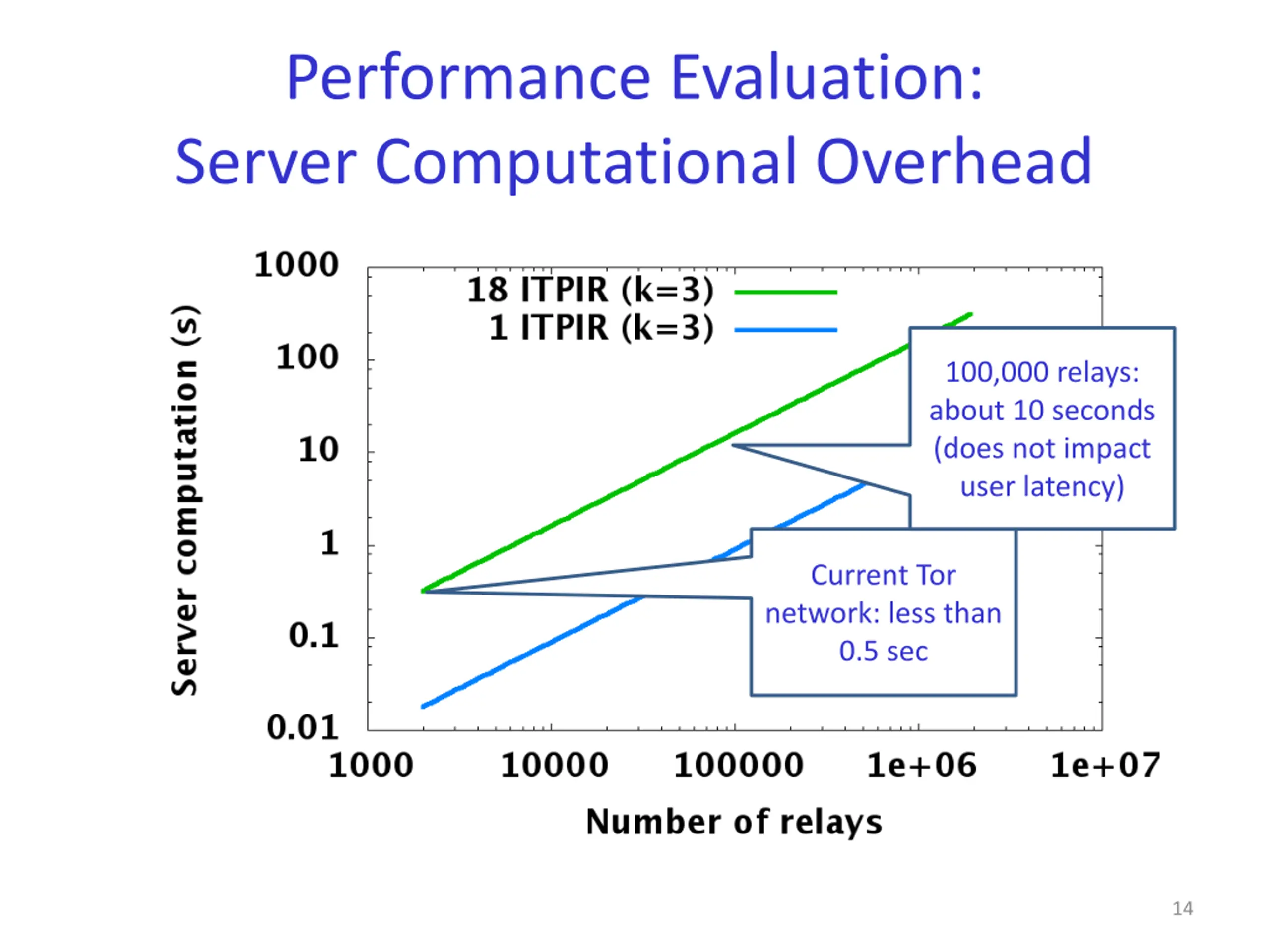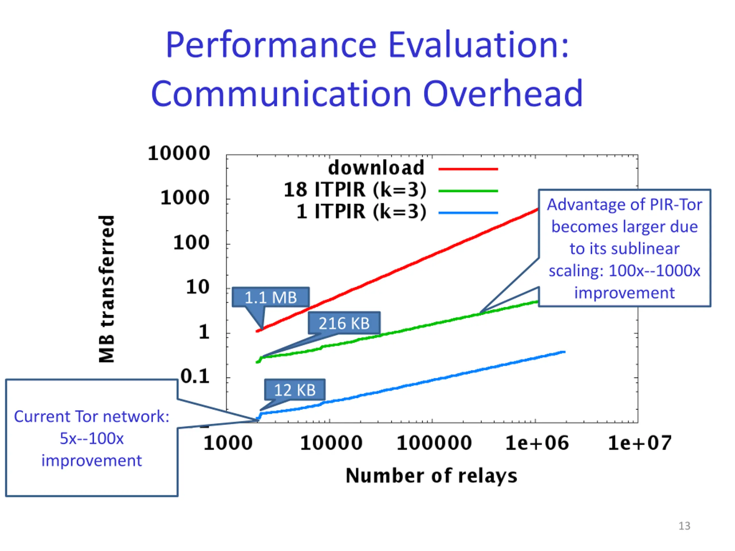 Performance Evaluation: Communication Overhead Advantage of PIR-Tor becomes larger due to its sublinear scaling: 100x--1000x improvement 1.1 MB 216 KB 12 KB Current Tor network: 5x--100x improvement 13