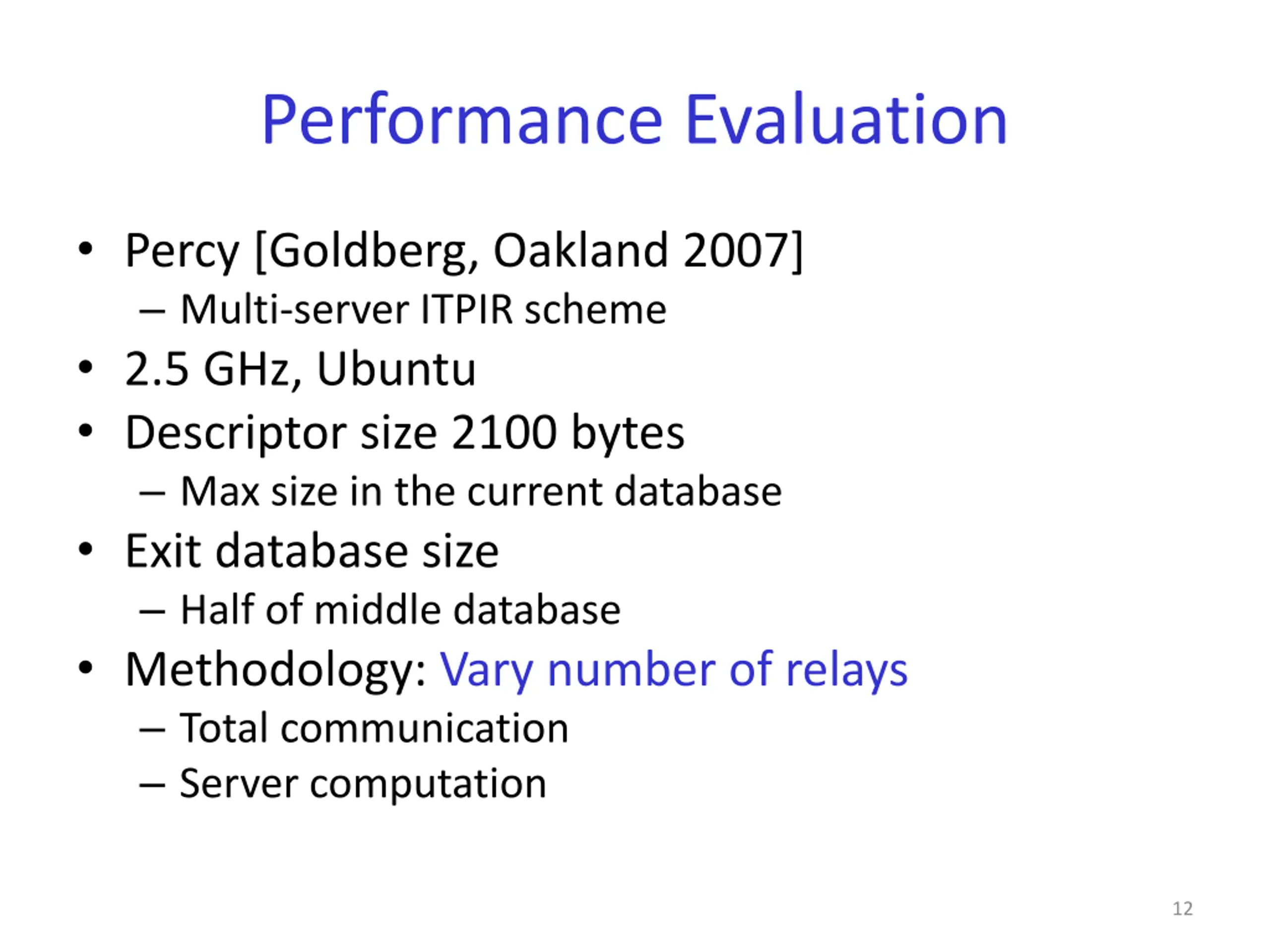 Performance Evaluation Percy [Goldberg, Oakland 2007] Multi-server ITPIR scheme 2.5 GHz, Ubuntu Descriptor size 2100 bytes Max size in the current database Exit database size Half of middle database Methodology: Vary number of relays Total communication Server computation 12