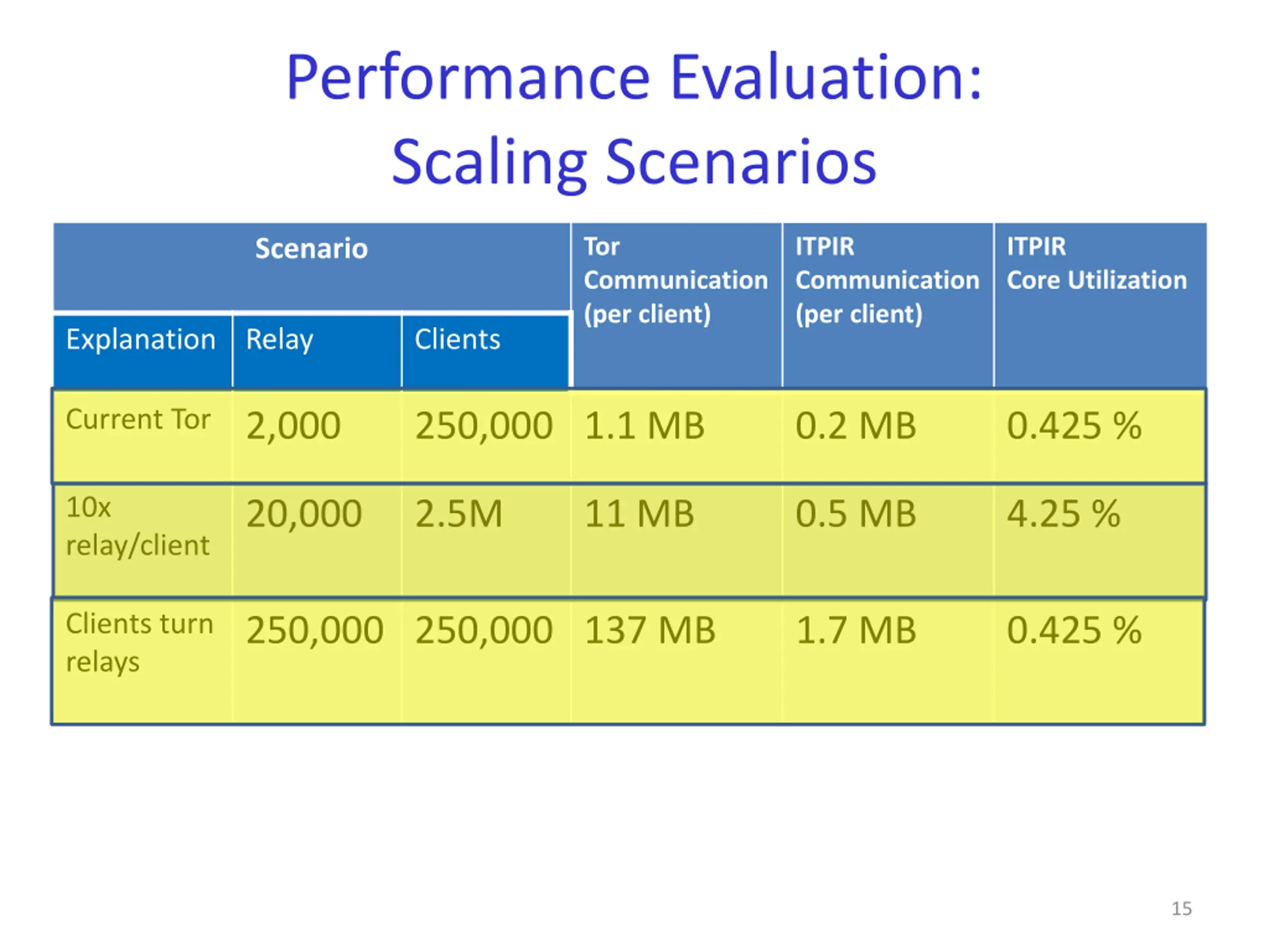 Performance Evaluation: Scaling Scenarios Tor Communication (per client) ITPIR Communication (per client) ITPIR Core Utilization Scenario Explanation Relay Clients Current Tor 2,000 250,000 1.1 MB 0.2 MB 0.425 % 10x relay/client 20,000 2.5M 11 MB 0.5 MB 4.25 % Clients turn relays 250,000 250,000 137 MB 1.7 MB 0.425 % 15
