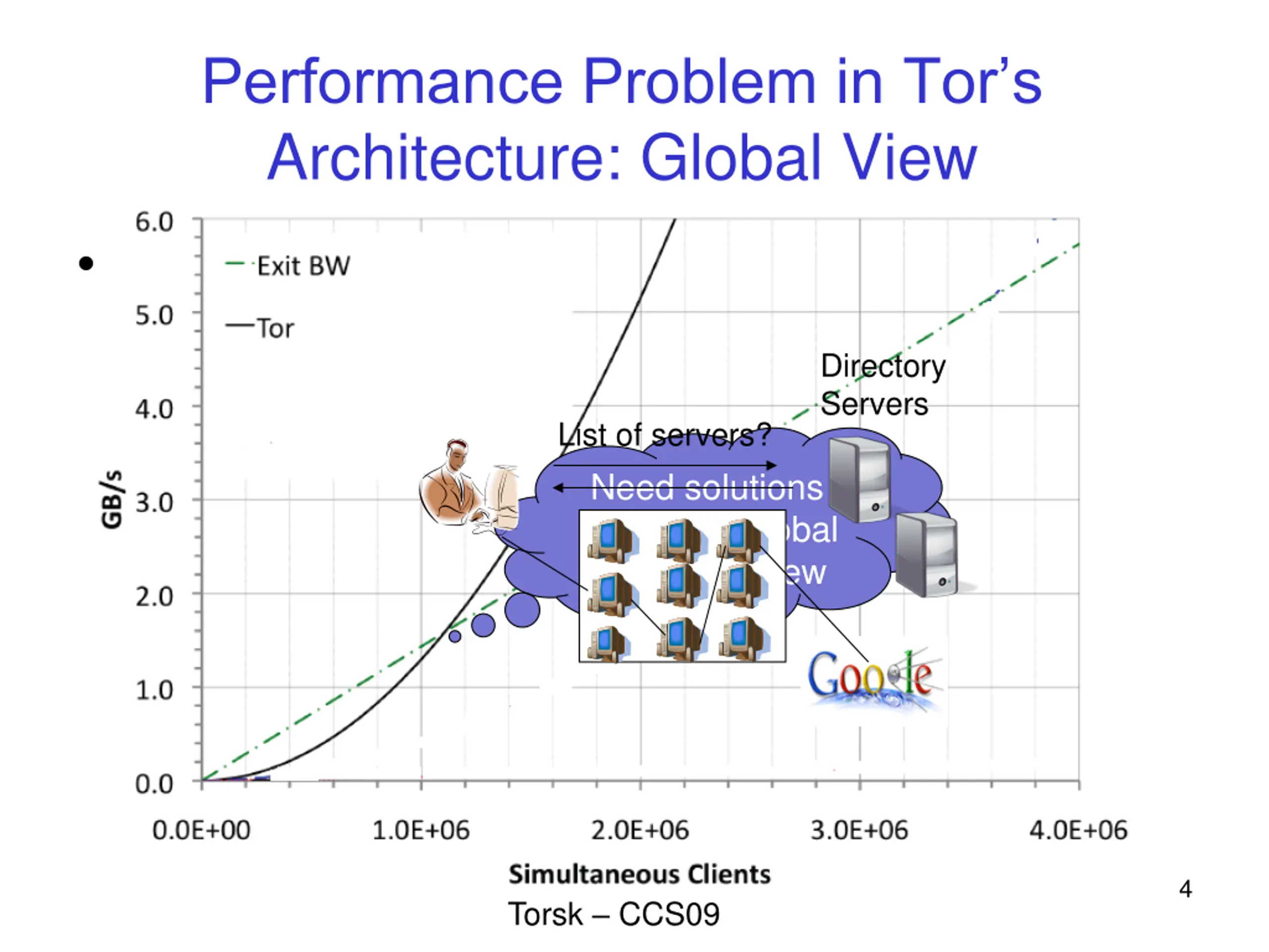 Performance Problem in Tors Architecture: Global View Global view Not scalable Directory Servers List of servers? Need solutions without global system view 4 Torsk CCS09
