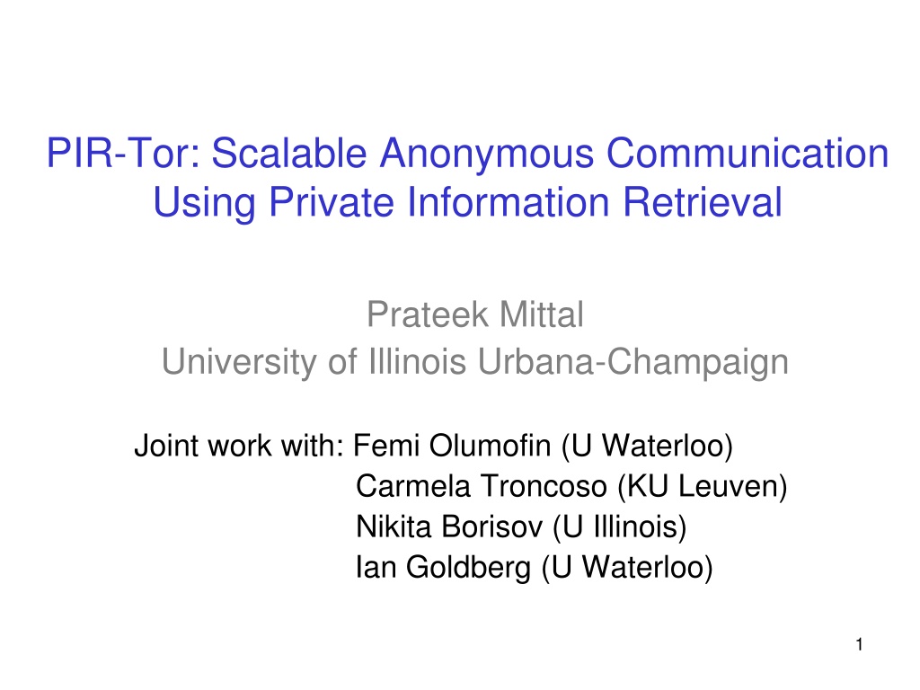 PIR-Tor: Scalable Anonymous Communication Using Private Information Retrieval Prateek Mittal University of Illinois Urbana-Champaign Joint work with: Femi Olumofin (U Waterloo) Carmela Troncoso (KU Leuven) Nikita Borisov (U Illinois) Ian Goldberg (U Waterloo) 1