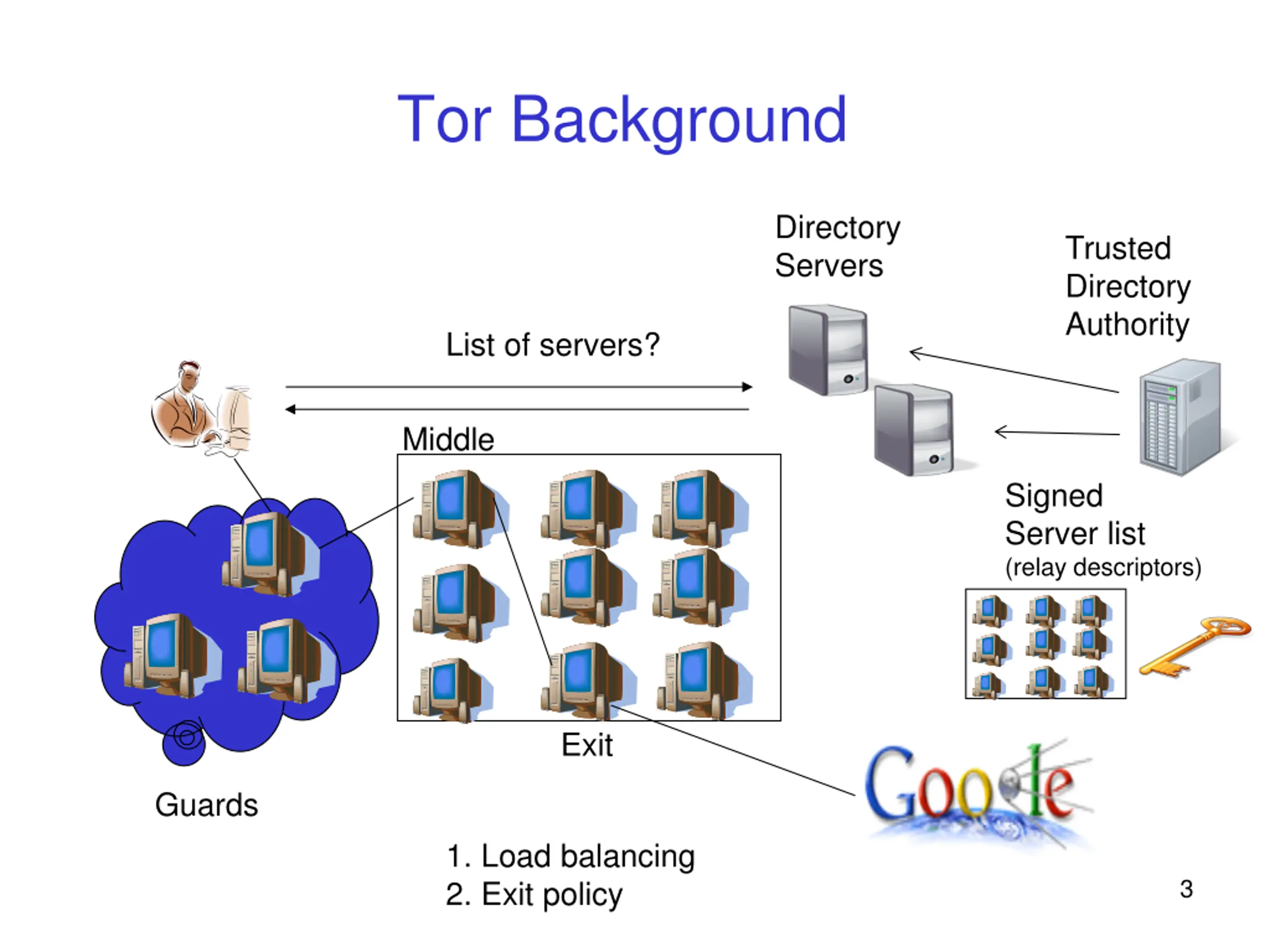 Tor Background Directory Servers Trusted Directory Authority List of servers? Middle Signed Server list (relay descriptors) Exit Guards 1. Load balancing 2. Exit policy 3