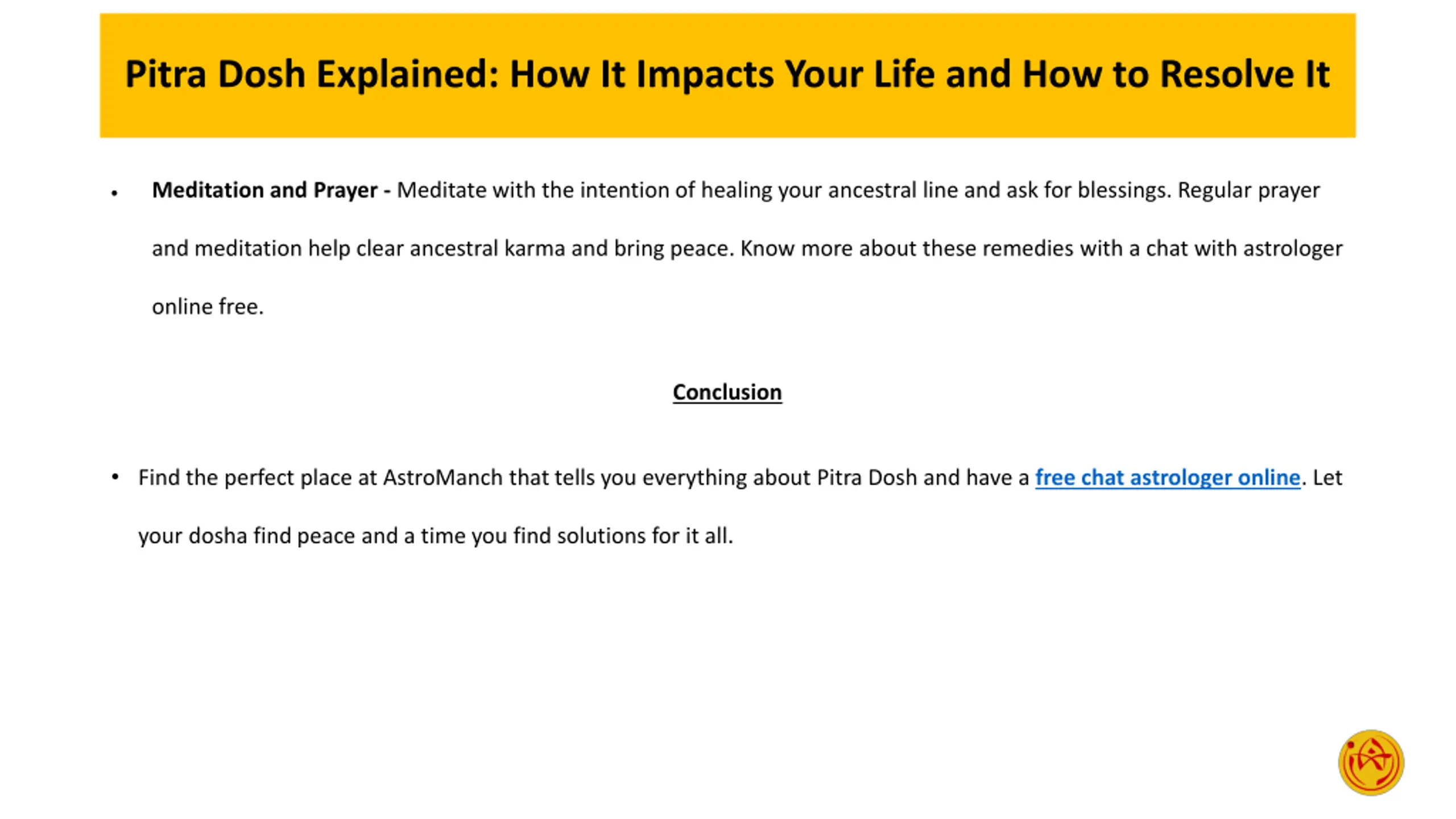 Pitra Dosh Explained: How It Impacts Your Life and How to Resolve It Meditation and Prayer - Meditate with the intention of healing your ancestral line and ask for blessings. Regular prayer and meditation help clear ancestral karma and bring peace. Know more about these remedies with a chat with astrologer online free. Conclusion Find the perfect place at AstroManch that tells you everything about Pitra Dosh and have a free chat astrologer online. Let your dosha find peace and a time you find solutions for it all.