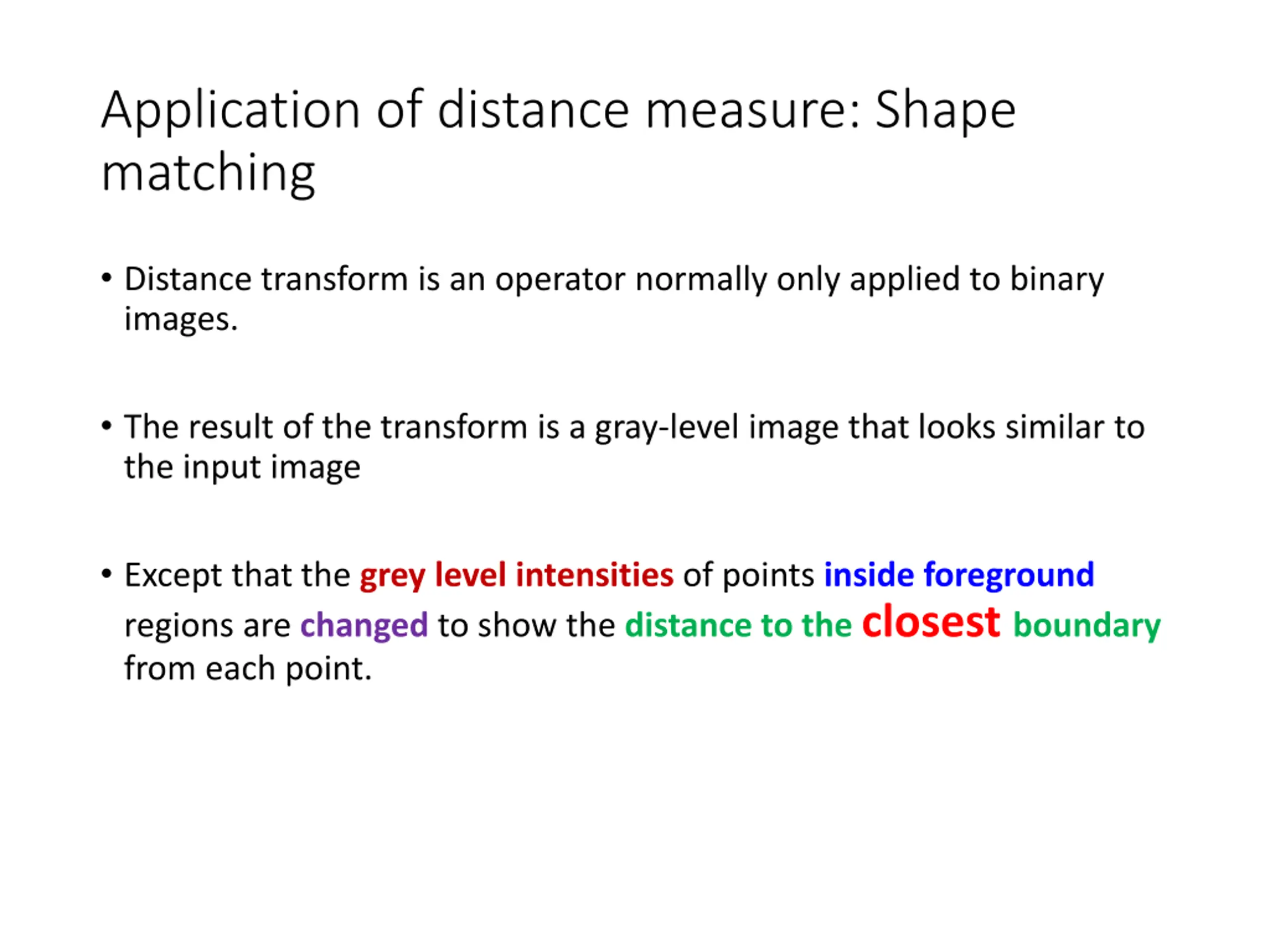 Application of distance measure: Shape matching Distance transform is an operator normally only applied to binary images. The result of the transform is a gray-level image that looks similar to the input image Except that the grey level intensities of points inside foreground regions are changed to show the distance to the closest boundary from each point.