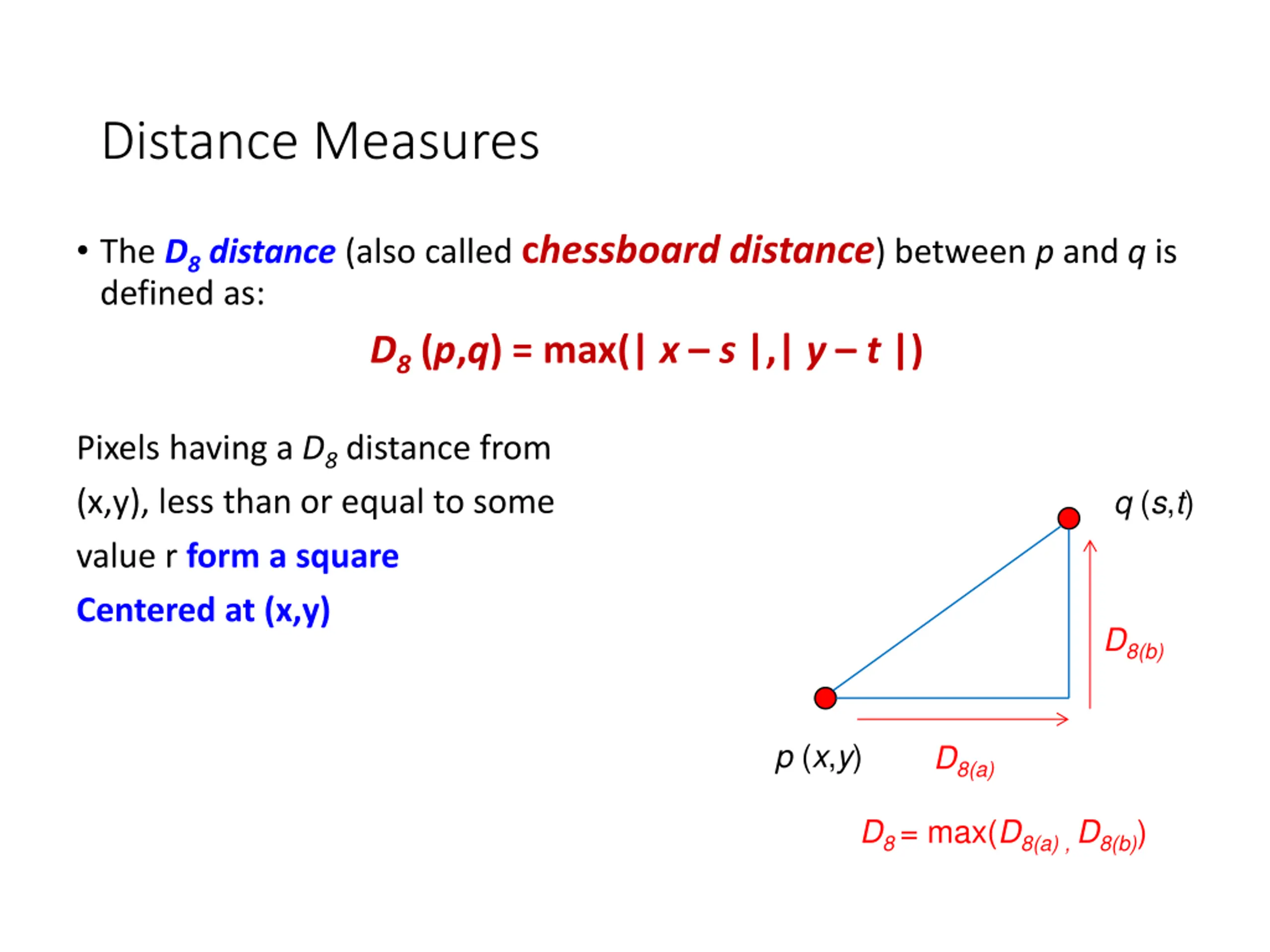 Distance Measures Dm distance: is defined as the shortest m-path between the points. In this case, the distance between two pixels will depend on the values of the pixels along the path, as well as the values of their neighbors.