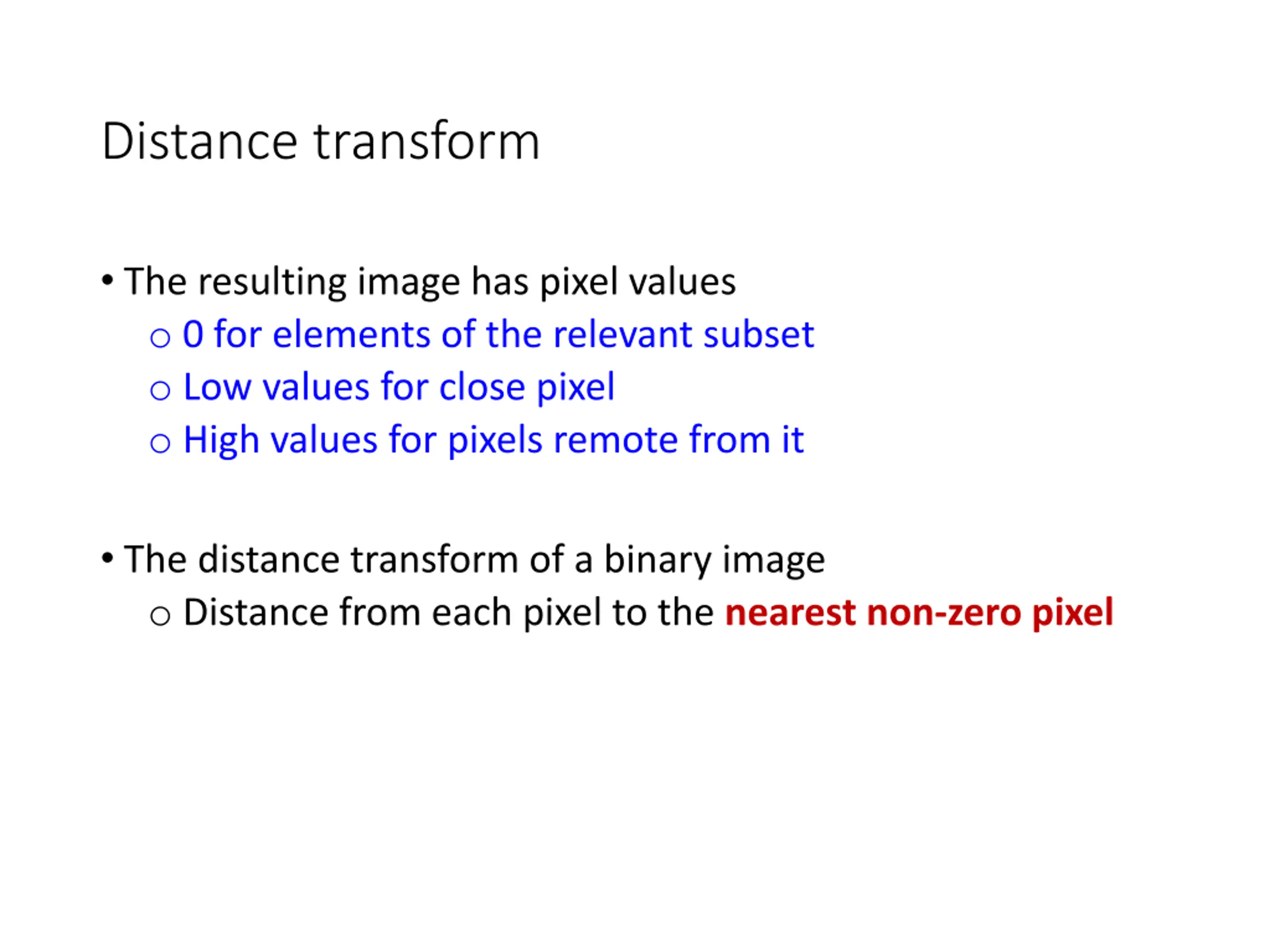Distance transform The resulting image has pixel values o 0 for elements of the relevant subset o Low values for close pixel o High values for pixels remote from it The distance transform of a binary image o Distance from each pixel to the nearest non-zero pixel