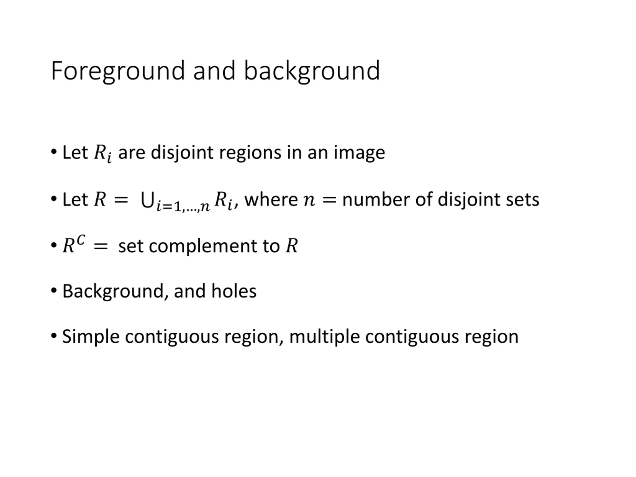 Foreground and background Let ??are disjoint regions in an image Let ? = ?=1, ,???, where ? = number of disjoint sets ??= set complement to ? Background, and holes Simple contiguous region, multiple contiguous region