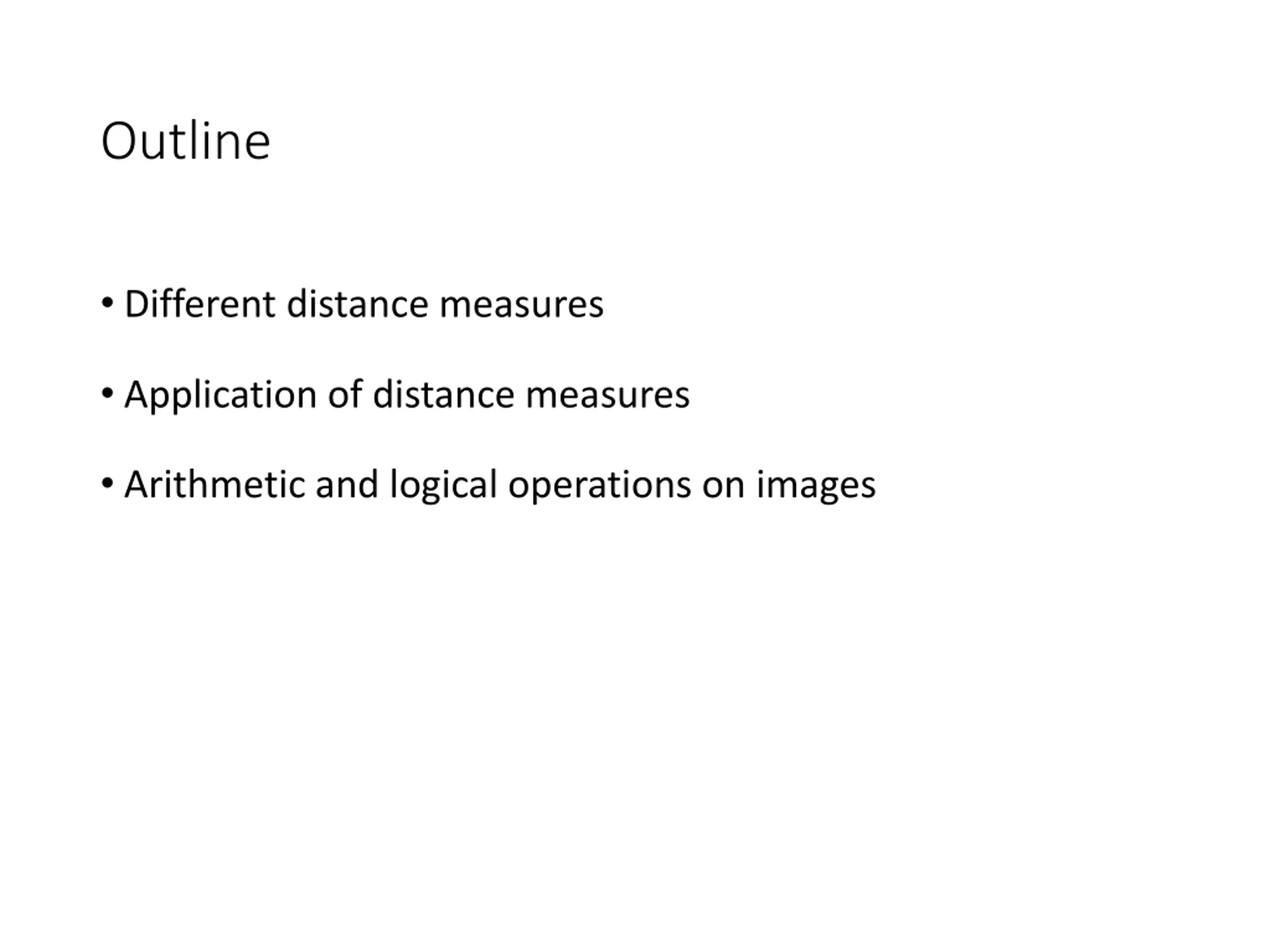 Outline Different distance measures Application of distance measures Arithmetic and logical operations on images