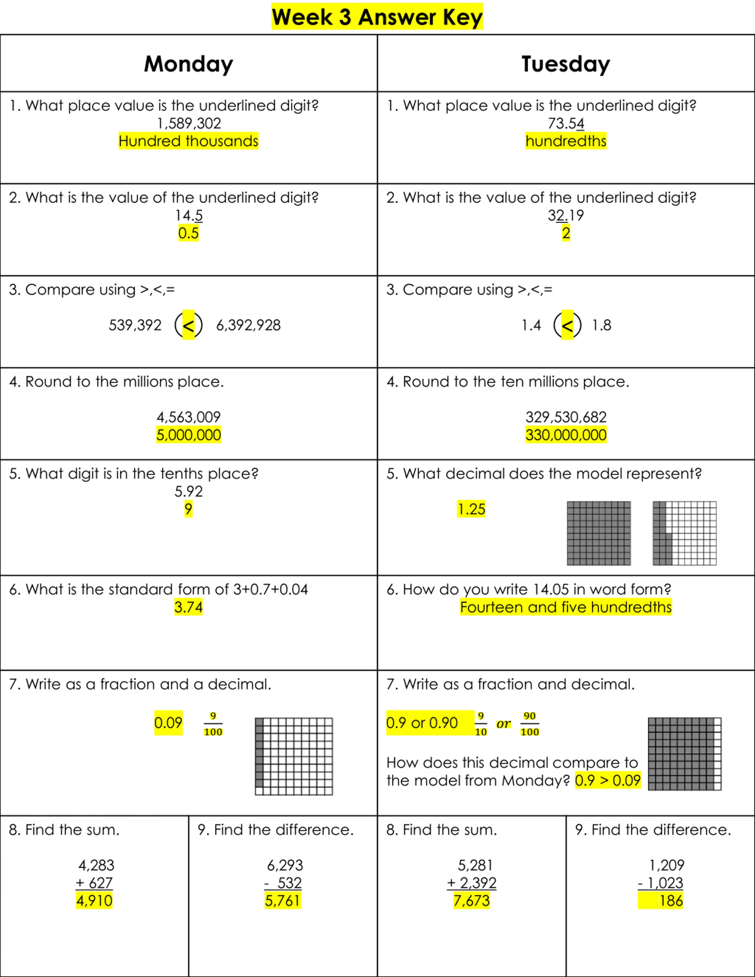Week 3 Answer Key Monday Tuesday 1. What place value is the underlined digit? 1,589,302 Hundred thousands 1. What place value is the underlined digit? 73.54 hundredths 2. What is the value of the underlined digit? 2. What is the value of the underlined digit? 14.5 0.5 32.19 2 3. Compare using >,<,= 3. Compare using >,<,= 539,392 6,392,928 < 1.4 1.8 < 4. Round to the millions place. 4. Round to the ten millions place. 4,563,009 5,000,000 329,530,682 330,000,000 5. What digit is in the tenths place? 5. What decimal does the model represent? 1.25 5.92 9 6. What is the standard form of 3+0.7+0.04 6. How do you write 14.05 in word form? Fourteen and five hundredths 3.74 7. Write as a fraction and a decimal. 7. Write as a fraction and decimal. 9 0.9 or 0.90 9 90 100 0.09 10?? 100 How does this decimal compare to the model from Monday? 0.9 > 0.09 8. Find the sum. 9. Find the difference. 8. Find the sum. 9. Find the difference. 4,283 + 627 4,910 6,293 - 532 5,761 5,281 + 2,392 7,673 1,209 - 1,023 186