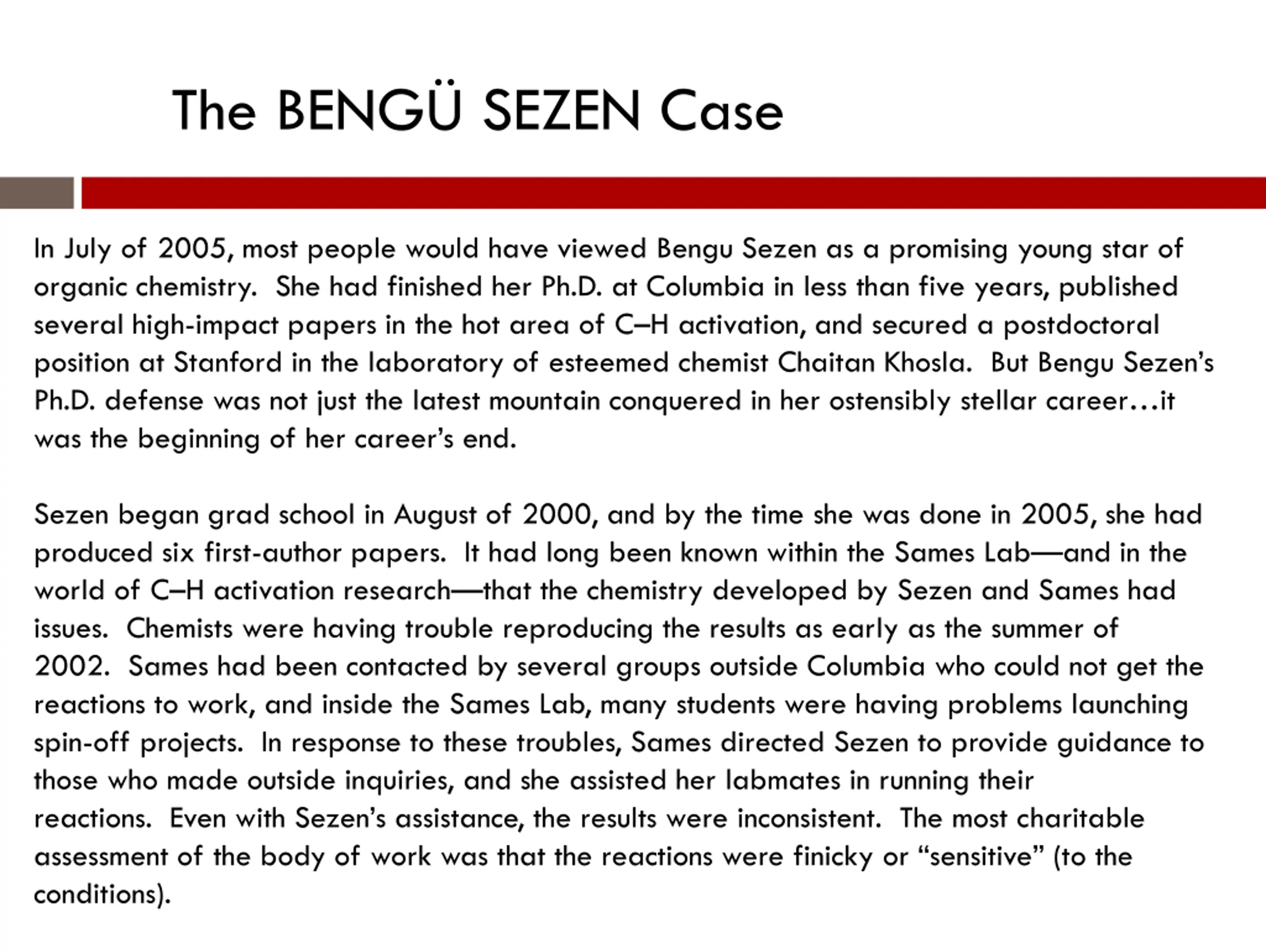 The BENG SEZEN Case In July of 2005, most people would have viewed Bengu Sezen as a promising young star of organic chemistry. She had finished her Ph.D. at Columbia in less than five years, published several high-impact papers in the hot area of C H activation, and secured a postdoctoral position at Stanford in the laboratory of esteemed chemist Chaitan Khosla. But Bengu Sezen s Ph.D. defense was not just the latest mountain conquered in her ostensibly stellar career it was the beginning of her career s end. Sezen began grad school in August of 2000, and by the time she was done in 2005, she had produced six first-author papers. It had long been known within the Sames Lab and in the world of C H activation research that the chemistry developed by Sezen and Sames had issues. Chemists were having trouble reproducing the results as early as the summer of 2002. Sames had been contacted by several groups outside Columbia who could not get the reactions to work, and inside the Sames Lab, many students were having problems launching spin-off projects. In response to these troubles, Sames directed Sezen to provide guidance to those who made outside inquiries, and she assisted her labmates in running their reactions. Even with Sezen s assistance, the results were inconsistent. The most charitable assessment of the body of work was that the reactions were finicky or sensitive (to the conditions).