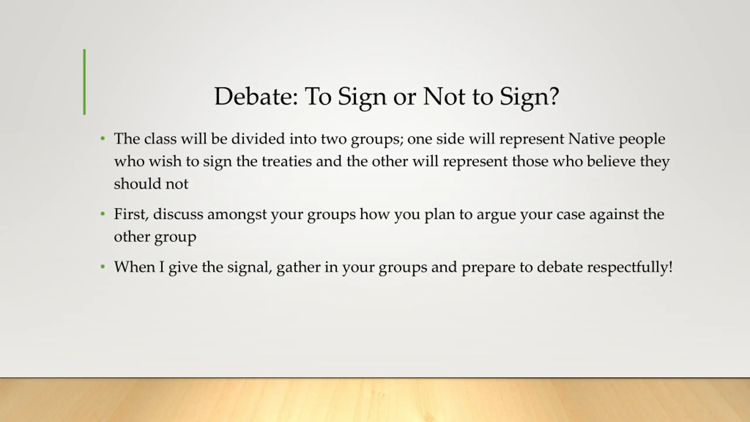 Debate: To Sign or Not to Sign? The class will be divided into two groups; one side will represent Native people who wish to sign the treaties and the other will represent those who believe they should not First, discuss amongst your groups how you plan to argue your case against the other group When I give the signal, gather in your groups and prepare to debate respectfully!