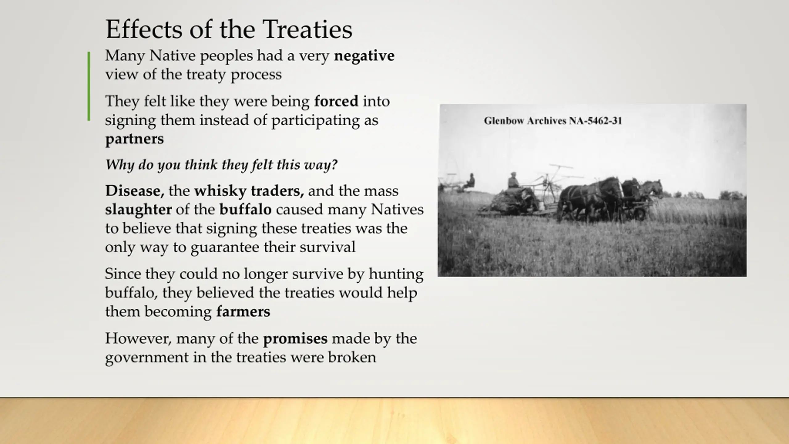Effects of the Treaties Many Native peoples had a very negative view of the treaty process They felt like they were being forced into signing them instead of participating as partners Why do you think they felt this way? Disease, the whisky traders, and the mass slaughter of the buffalo caused many Natives to believe that signing these treaties was the only way to guarantee their survival Since they could no longer survive by hunting buffalo, they believed the treaties would help them becoming farmers However, many of the promises made by the government in the treaties were broken