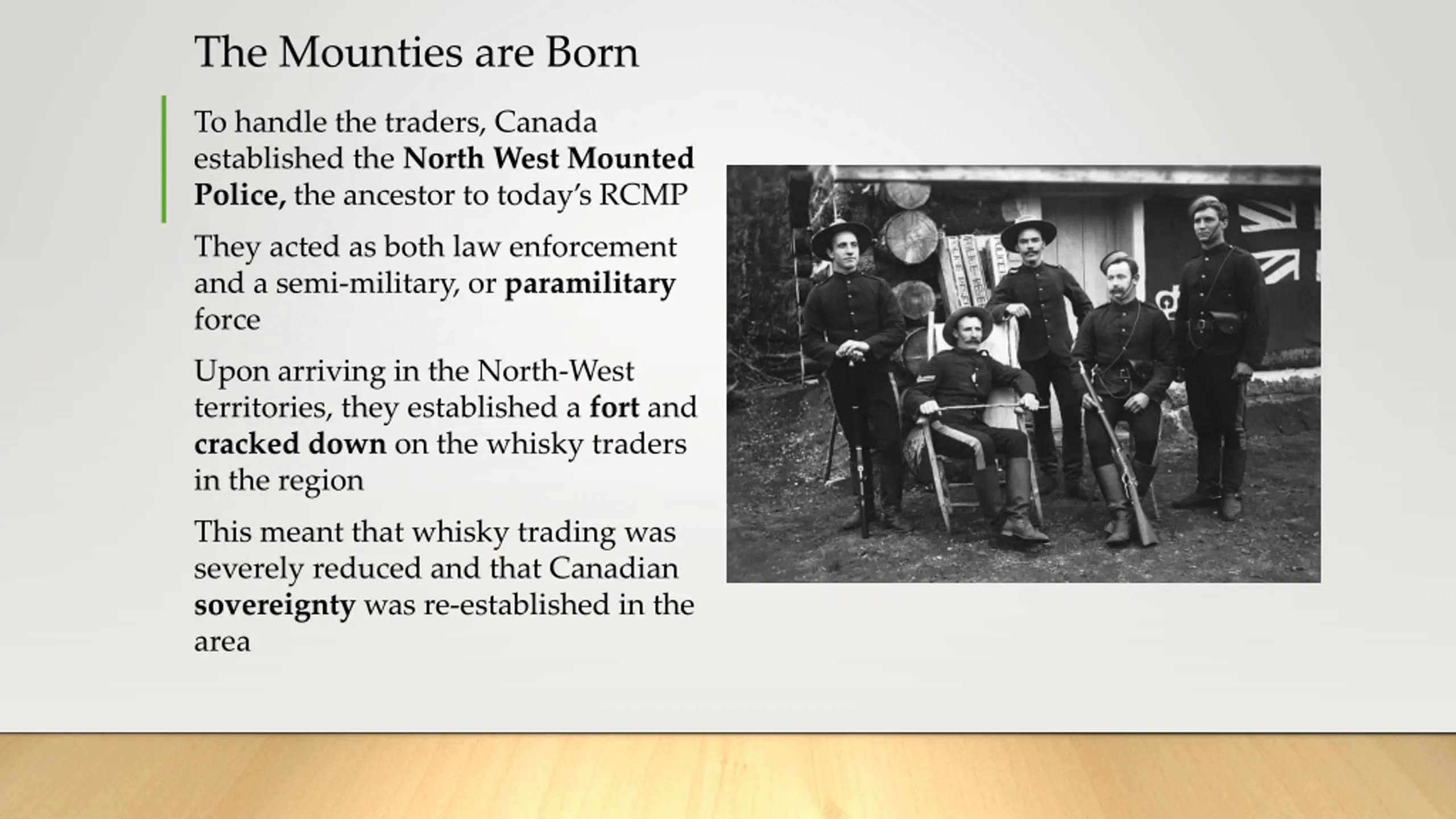 The Mounties are Born To handle the traders, Canada established the North West Mounted Police, the ancestor to today s RCMP They acted as both law enforcement and a semi-military, or paramilitary force Upon arriving in the North-West territories, they established a fort and cracked down on the whisky traders in the region This meant that whisky trading was severely reduced and that Canadian sovereignty was re-established in the area