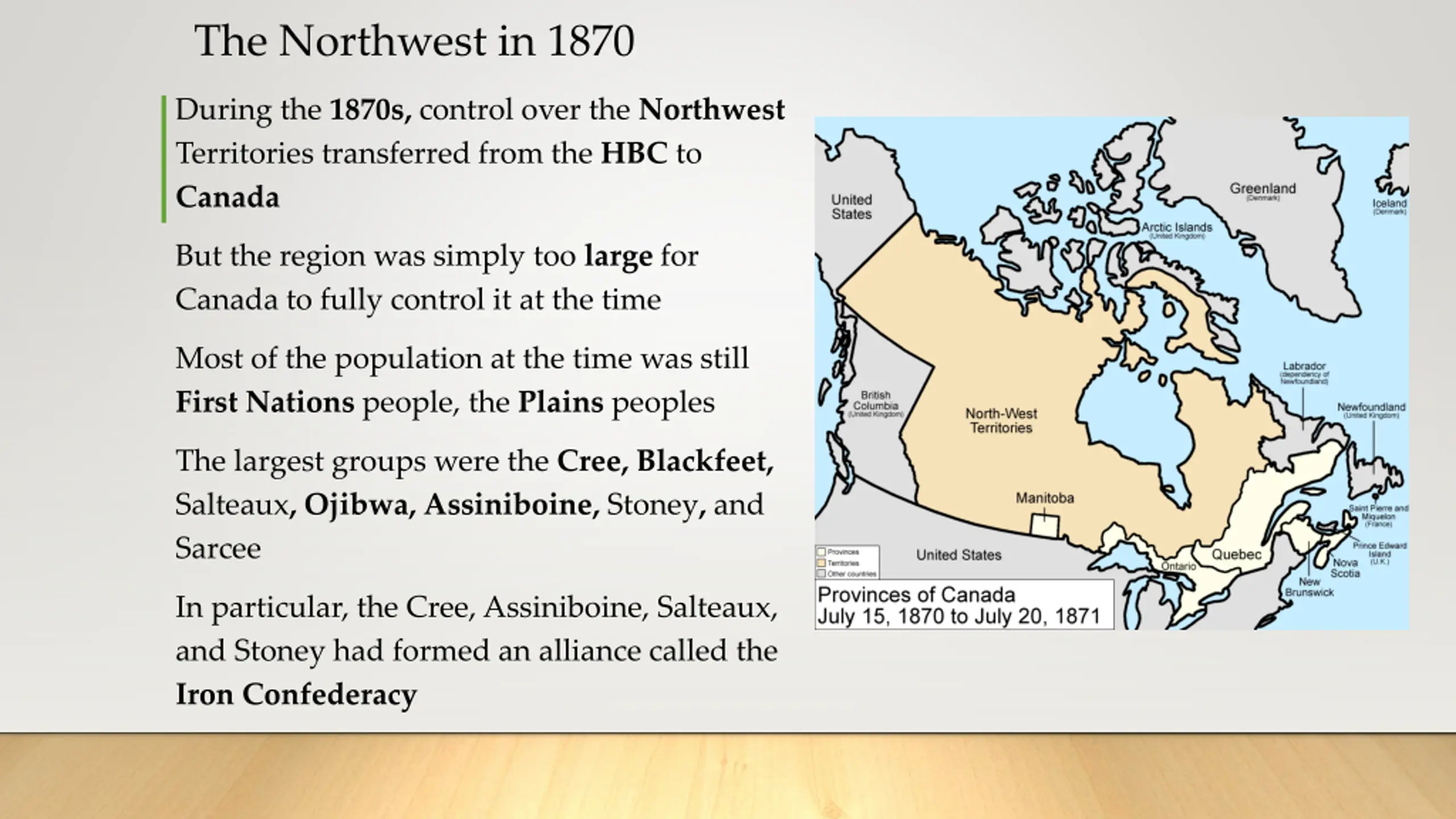 The Northwest in 1870 During the 1870s, control over the Northwest Territories transferred from the HBC to Canada But the region was simply too large for Canada to fully control it at the time Most of the population at the time was still First Nations people, the Plains peoples The largest groups were the Cree, Blackfeet, Salteaux, Ojibwa, Assiniboine, Stoney, and Sarcee In particular, the Cree, Assiniboine, Salteaux, and Stoney had formed an alliance called the Iron Confederacy