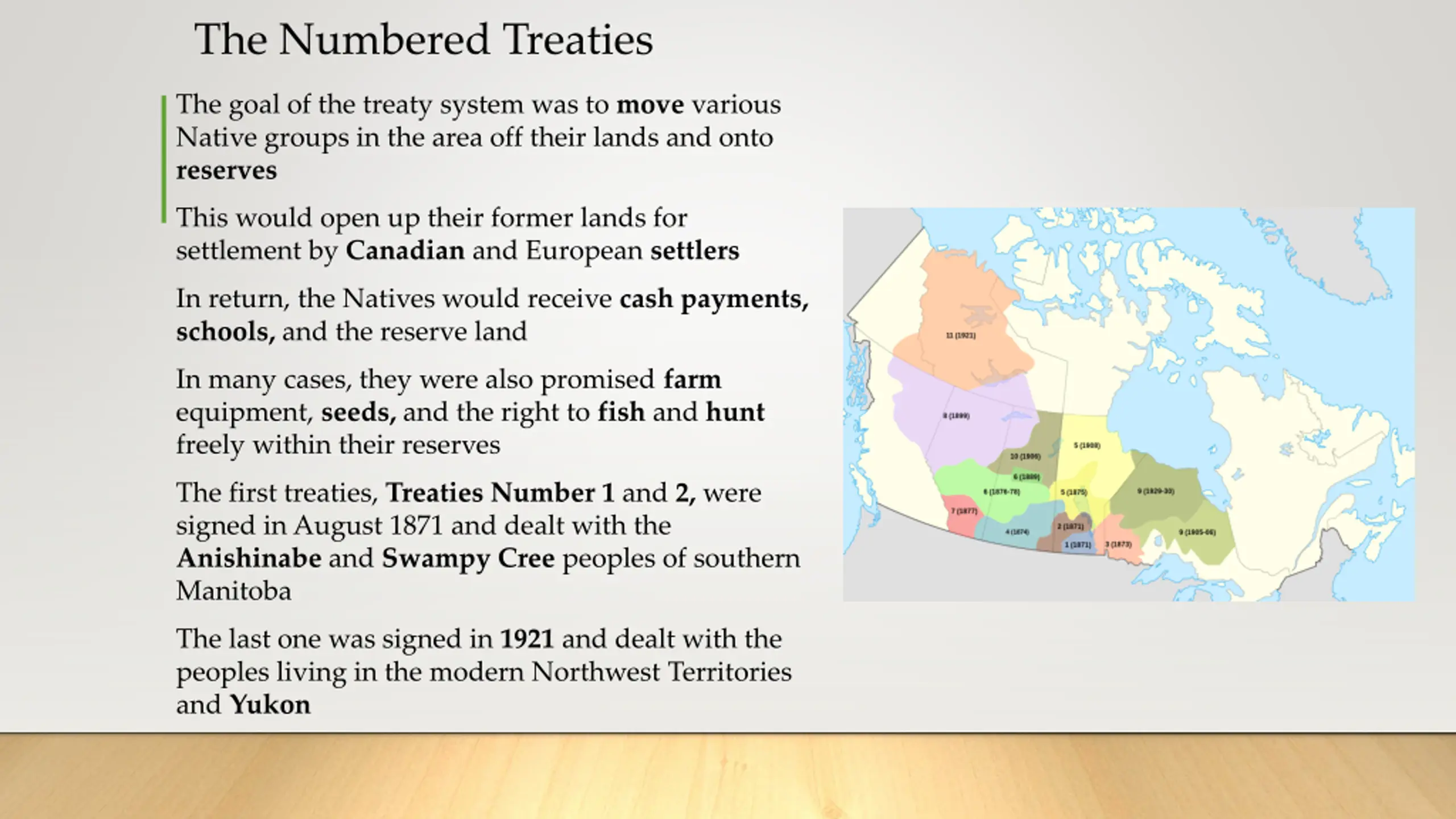 The Numbered Treaties The goal of the treaty system was to move various Native groups in the area off their lands and onto reserves This would open up their former lands for settlement by Canadian and European settlers In return, the Natives would receive cash payments, schools, and the reserve land In many cases, they were also promised farm equipment, seeds, and the right to fish and hunt freely within their reserves The first treaties, Treaties Number 1 and 2, were signed in August 1871 and dealt with the Anishinabe and Swampy Cree peoples of southern Manitoba The last one was signed in 1921 and dealt with the peoples living in themodern Northwest Territories and Yukon