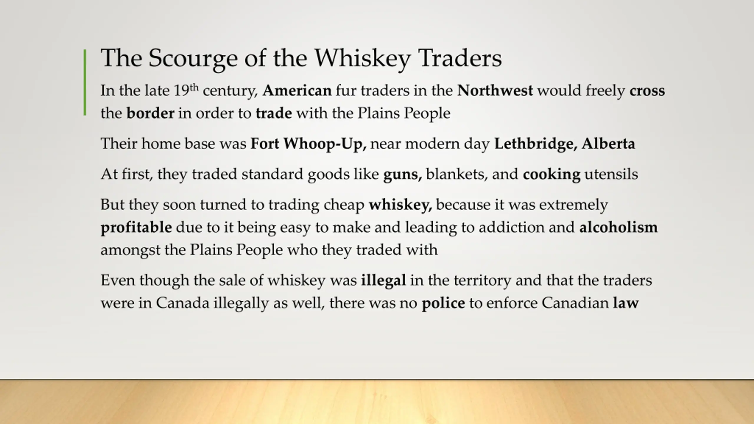 The Scourge of the Whiskey Traders In the late 19thcentury, American fur traders in the Northwest would freely cross the border in order to trade with the Plains People Their home base was Fort Whoop-Up, near modern day Lethbridge, Alberta At first, they traded standard goods like guns, blankets, and cooking utensils But they soon turned to trading cheap whiskey, because it was extremely profitable due to it being easy to make and leading to addiction and alcoholism amongst the Plains People who they traded with Even though the sale of whiskey was illegal in the territory and that the traders were in Canada illegally as well, there was no police to enforce Canadian law
