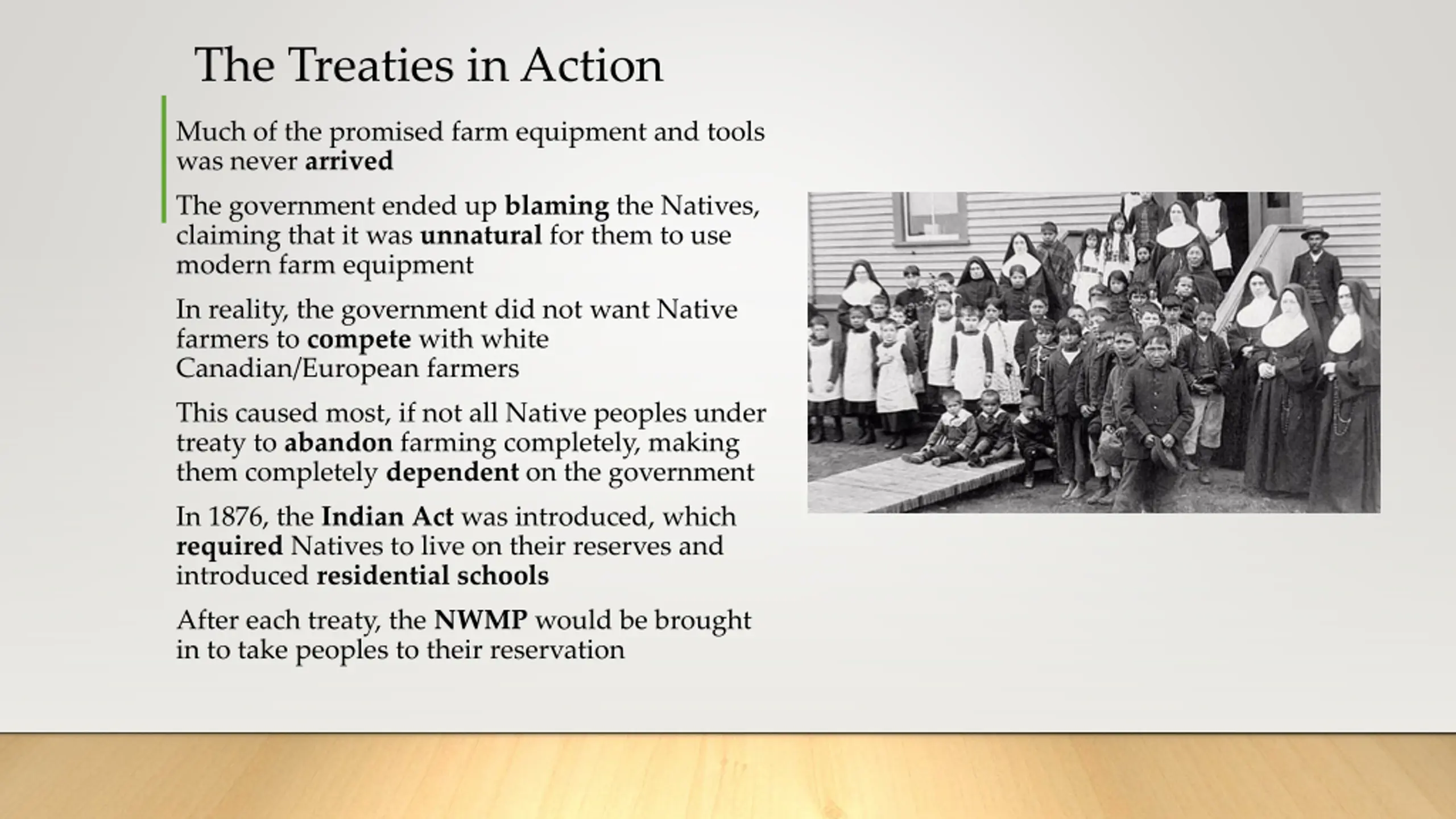 The Treaties in Action Much of the promised farm equipment and tools was never arrived The government ended up blaming the Natives, claiming that it was unnatural for them to use modern farm equipment In reality, the government did not want Native farmers to compete with white Canadian/European farmers This caused most, if not all Native peoples under treaty to abandon farming completely, making them completely dependent on the government In 1876, the Indian Act was introduced, which required Natives to live on their reserves and introduced residential schools After each treaty, the NWMP would be brought in to take peoples to their reservation