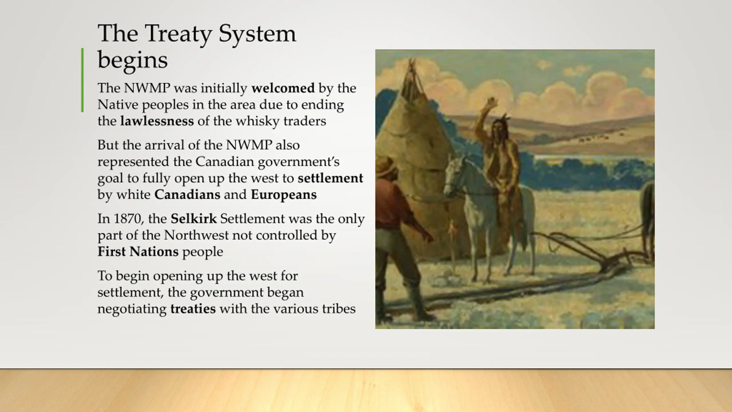 The Treaty System begins The NWMP was initially welcomed by the Native peoples in the area due to ending the lawlessness of the whisky traders But the arrival of the NWMP also represented the Canadian government s goal to fully open up the west to settlement by white Canadians and Europeans In 1870, the Selkirk Settlement was the only part of the Northwest not controlled by First Nations people To begin opening up the west for settlement, the government began negotiating treaties with the various tribes