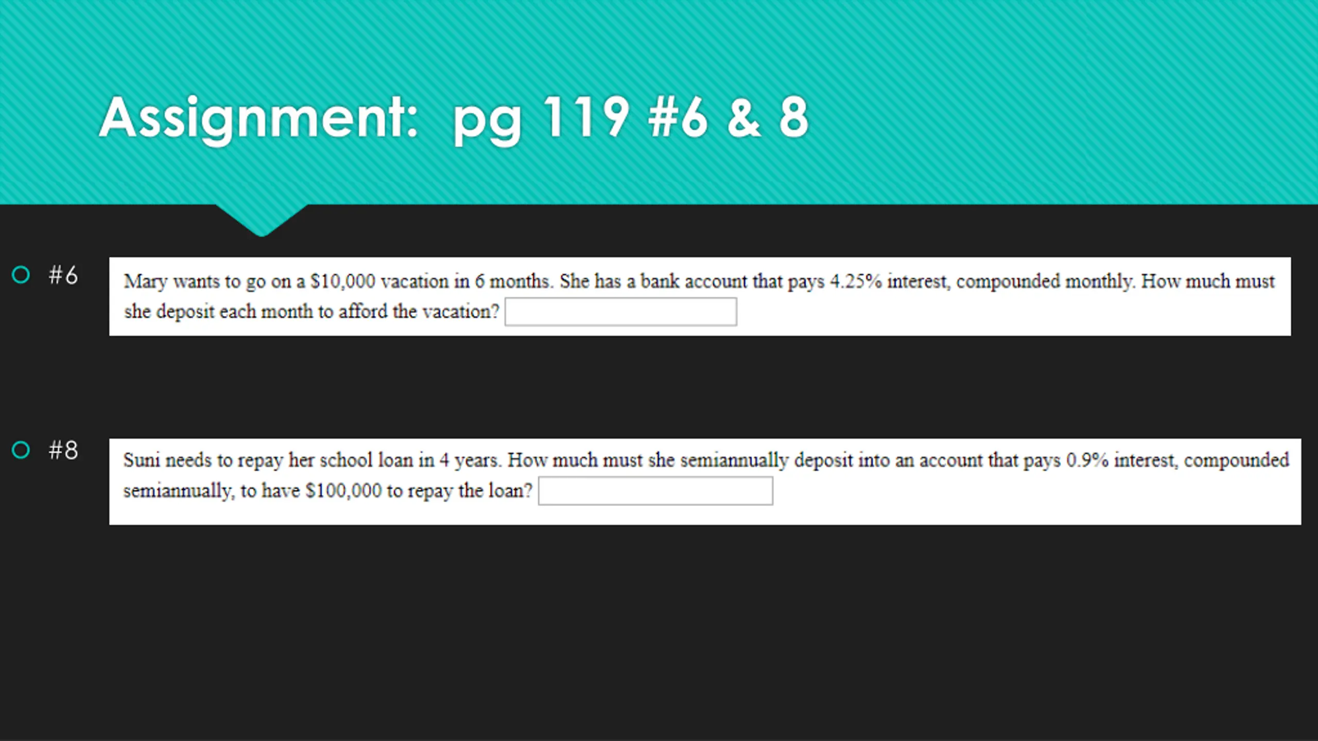 Present Value of a periodic deposit investment Formula (??) 1+? ? 1 ? A = ? ? A = ending amount r = rate as a decimal P = periodic deposit amount t = time n = number of deposits per year