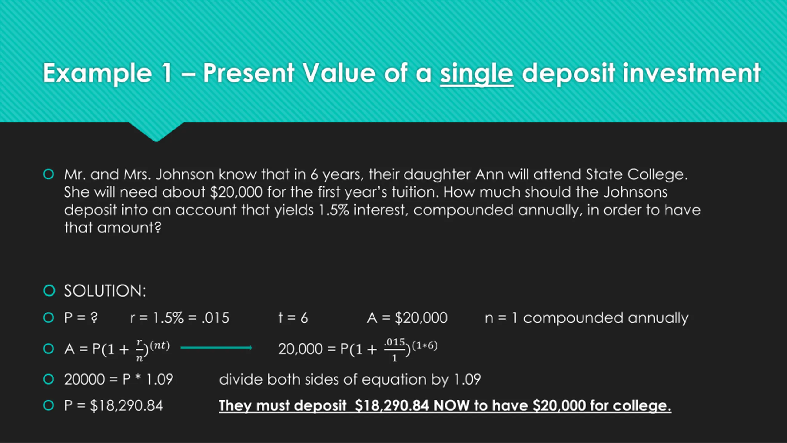 Example 1 Present Value of a single deposit investment Mr. and Mrs. Johnson know that in 6 years, their daughter Ann will attend State College. She will need about $20,000 for the first year s tuition. How much should the Johnsons deposit into an account that yields 1.5% interest, compounded annually, in order to have that amount? SOLUTION: P = ? r = 1.5% = .015 t = 6 A = $20,000 n = 1 compounded annually ? ?)(??) .015 1)(1 6) A = P(1 + 20,000 = P(1 + 20000 = P * 1.09 divide both sides of equation by 1.09 P = $18,290.84 They must deposit $18,290.84 NOW to have $20,000 for college.