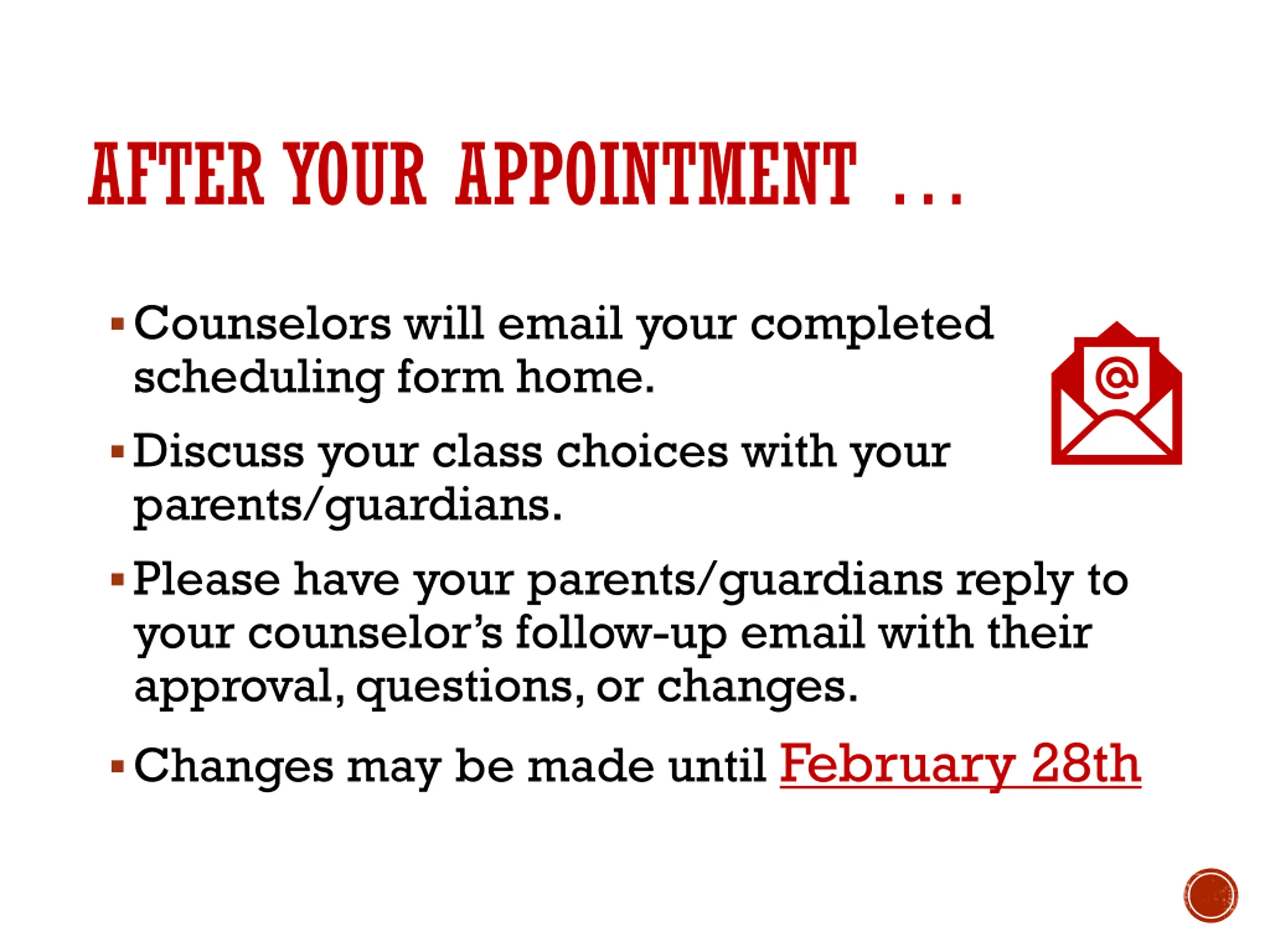 AFTER YOUR APPOINTMENT Counselors will email your completed scheduling form home. Discuss your class choices with your parents/guardians. Please have your parents/guardians reply to your counselor s follow-up email with their approval, questions, or changes. Changes may be made until February 28th