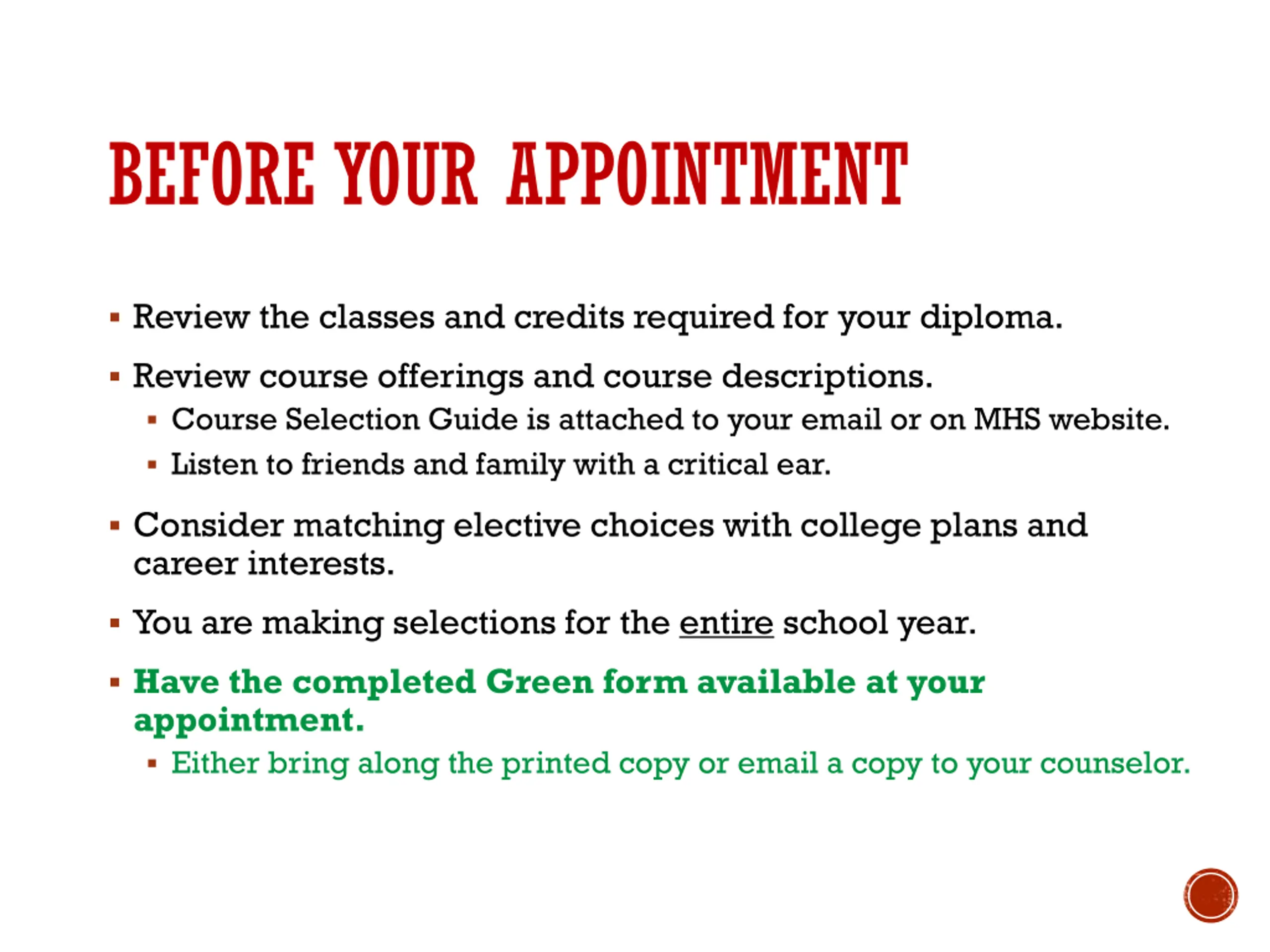 BEFORE YOUR APPOINTMENT Review the classes and credits required for your diploma. Review course offerings and course descriptions. Course Selection Guide is attached to your email or on MHS website. Listen to friends and family with a critical ear. Consider matching elective choices with college plans and career interests. You are making selections for the entire school year. Have the completed Green form available at your appointment. Either bring along the printed copy or email a copy to your counselor.
