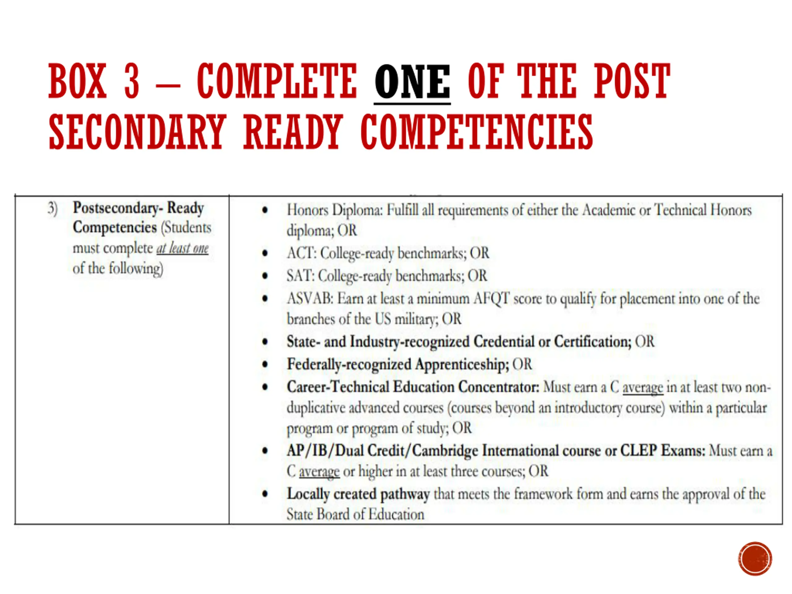 GRADUATION PATHWAYS Box 1: Earn your High School Diploma Box 2: Learn and Demonstrate Employability Skills Box 3: Complete ONE of the Post Secondary Ready Competencies
