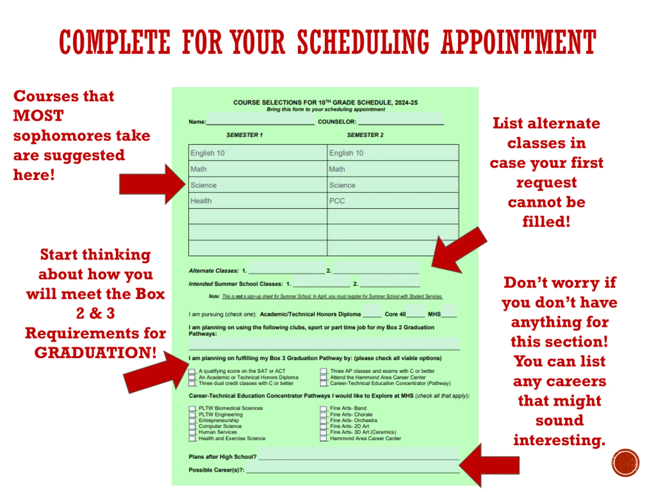 COMPLETE FOR YOUR SCHEDULING APPOINTMENT Courses that MOST sophomores take are suggested here! List alternate classes in case your first request cannot be filled! Start thinking about how you will meet the Box 2 & 3 Requirements for GRADUATION! Don t worry if you don t have anything for this section! You can list any careers that might sound interesting.
